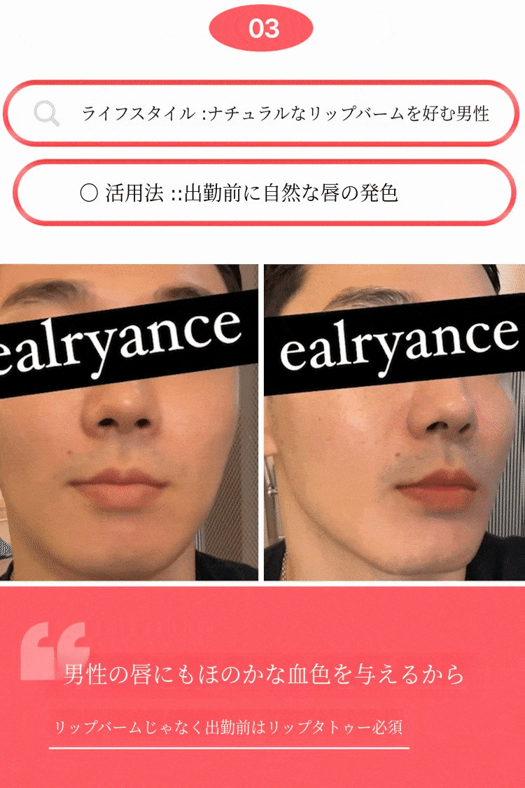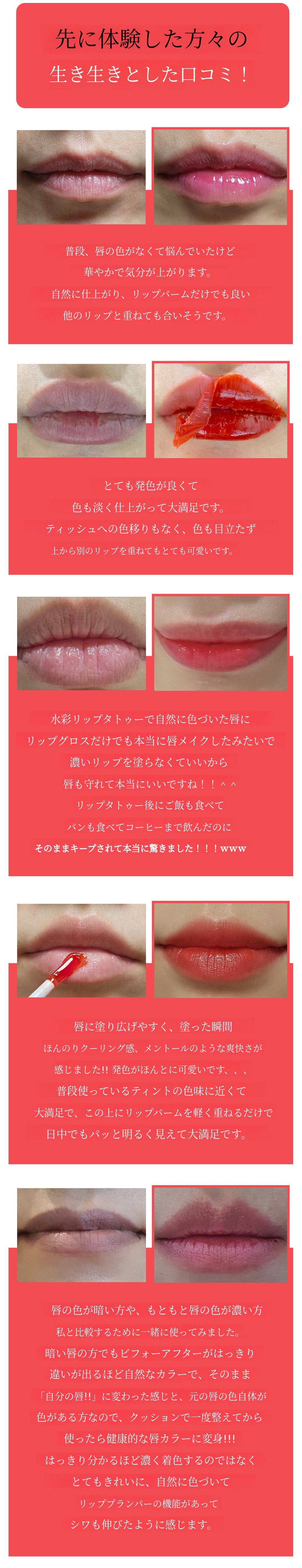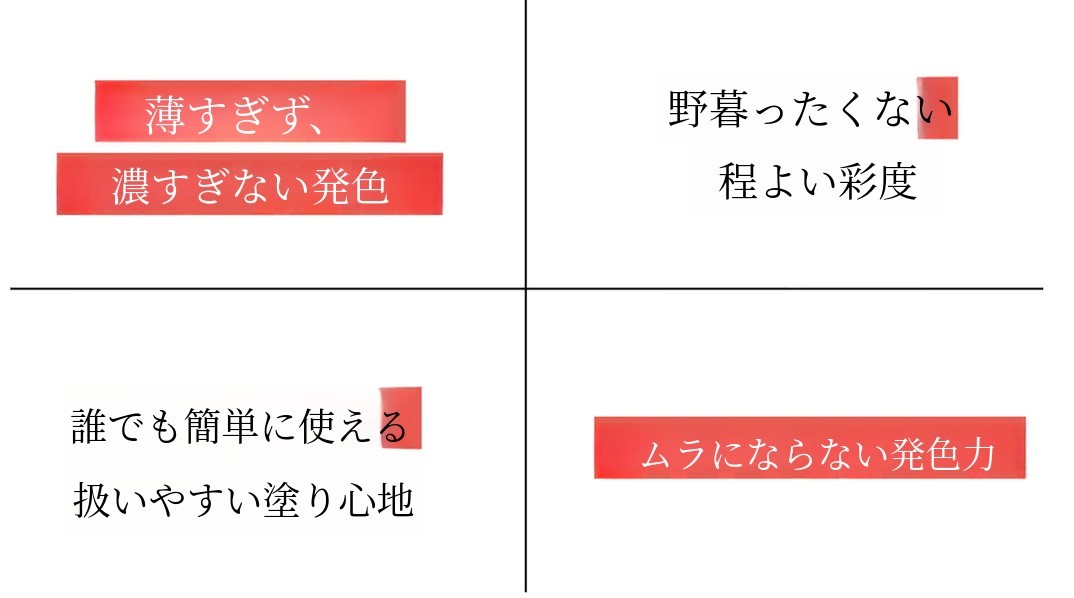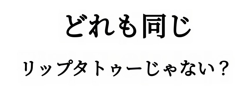 リップタトゥーは、一般的なリップ製品よりも作るのが倍大変です。 誰もが異なる唇の色を持っており、そのため着色の度合いや発色が異なるからです。 それでも私は、多くの方々が 満足できる (1) 自然なカラー. リップタトゥー特有の 野暮ったくて派手すぎる印象を与えないための (2) 適度な彩度、 誰でも (3) 使いやすさを考えて作り上げた塗り心地と、 ムラのある着色にならないように (4)適度な発色力を実現すること!これらすべてが満足できてこそ、本当の発売ができると考えました。