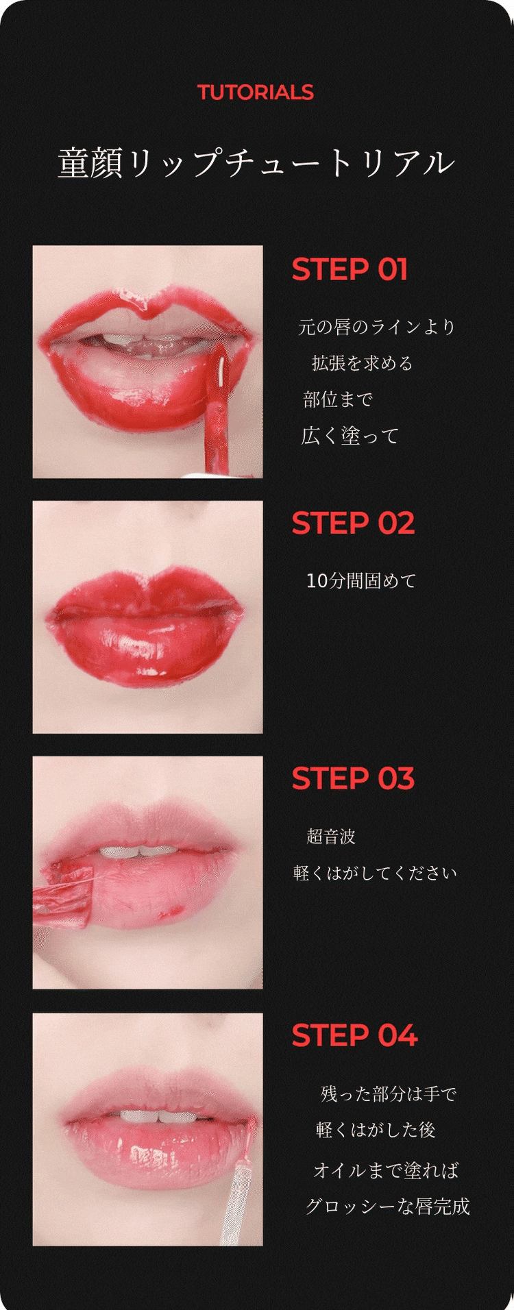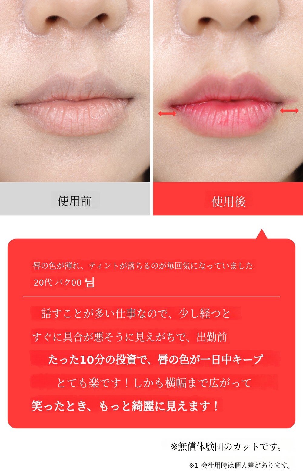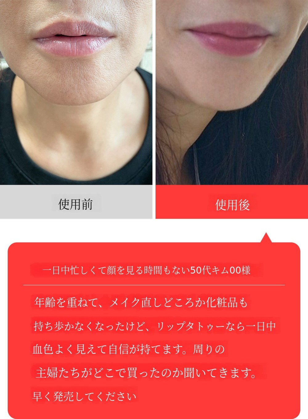 リップタトゥーは、一般的なリップ製品よりも作るのが倍大変です。 誰もが異なる唇の色を持っており、そのため着色の度合いや発色が異なるからです。 それでも私は、多くの方々が 満足できる (1) 自然なカラー. リップタトゥー特有の 野暮ったくて派手すぎる印象を与えないための (2) 適度な彩度、 誰でも (3) 使いやすさを考えて作り上げた塗り心地と、 ムラのある着色にならないように (4)適度な発色力を実現すること!これらすべてが満足できてこそ、本当の発売ができると考えました。