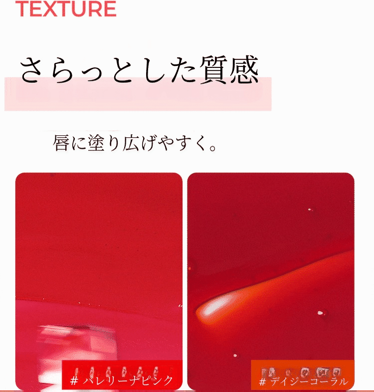 ややさらっとしたテクスチャーで、唇に伸ばしやすいように開発されました。