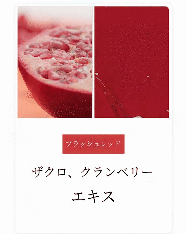 おすすめ: 失敗のないカラーなので、本当にすべての方におすすめします。メーカーPickです。多彩なカラーはもちろん、普段モノトーンの黒・グレー・白の服を好んで着られる方には、これ以上ないデイリーカラーになると自信を持っておすすめします。すっぴんにもよく似合うので、いわゆる “血色リップ”と呼ばれる「ブラッシュレッド」、ぜひ気軽にチャレンジしてみてください!