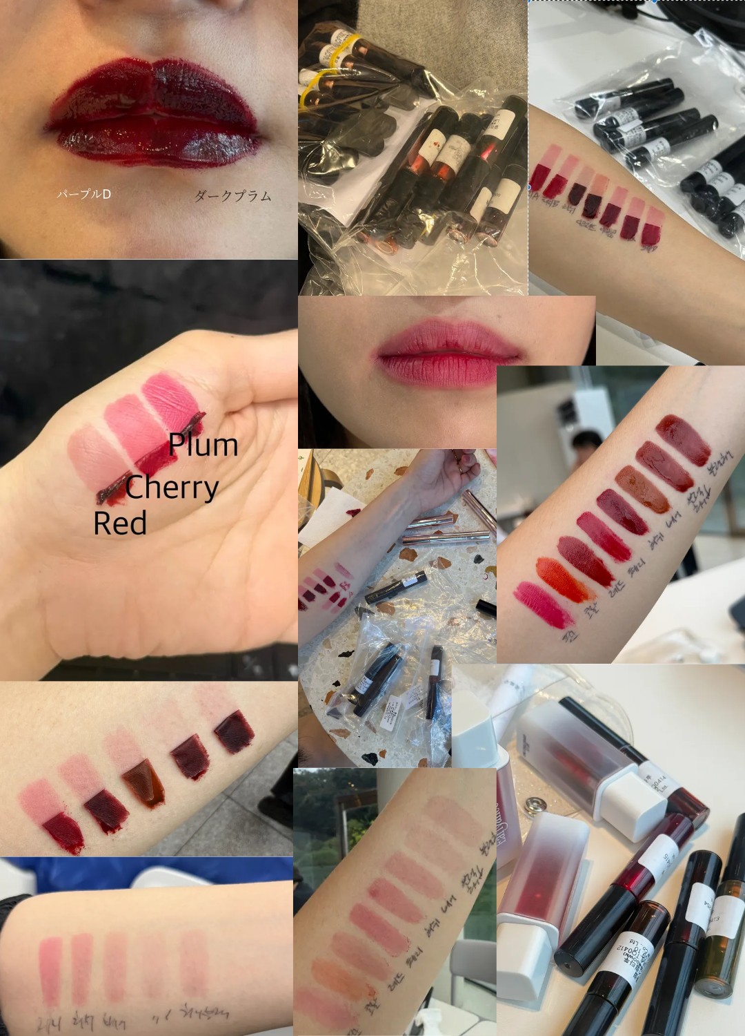 レッドとチェリープラムのカラーが似て見えるかもしれないと思い、用意しました。ブラッシュレッドはナチュラルなニュートラルレッド, ジューシーチェリーは、もう少しクリアで明るい色, プラムは文字通り、よりプラム寄りで紫みのあるカラーです。濃さもレッドに比べて一段階ずつ高めです。しっかりとした存在感を求める方には必須アイテムです。