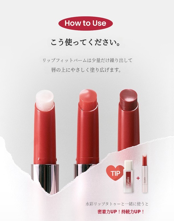 タトゥーの上にリップフィットバームを重ねてください。繊細なパールがきらめく01. ピュアグラス リップフィットバーム を重ねると、より輝いてふんわりとした唇になります。