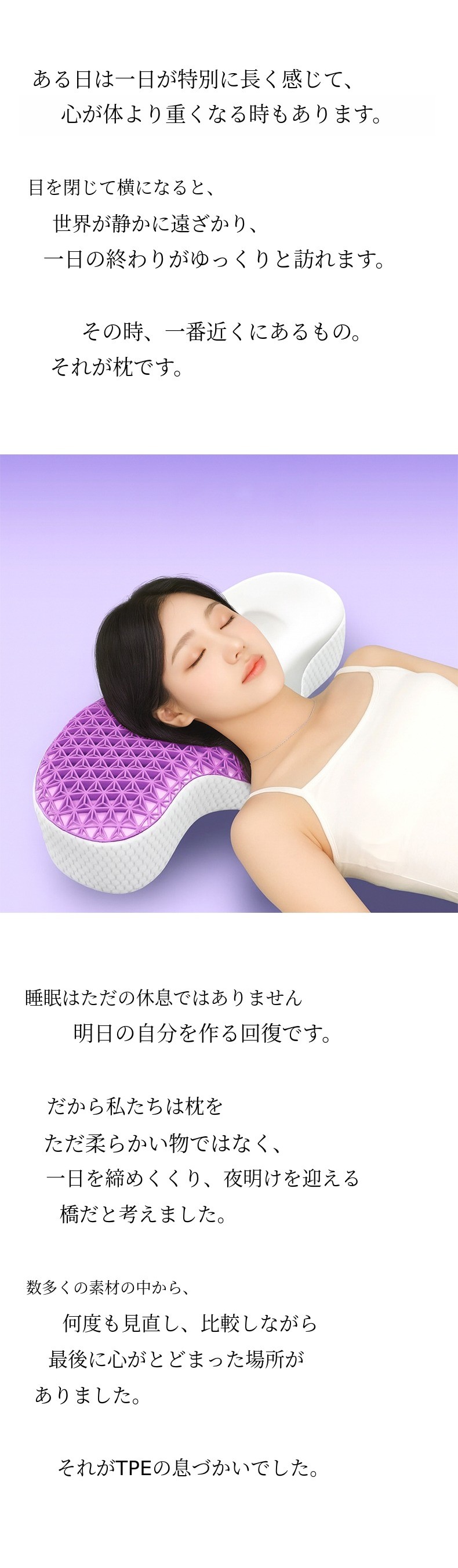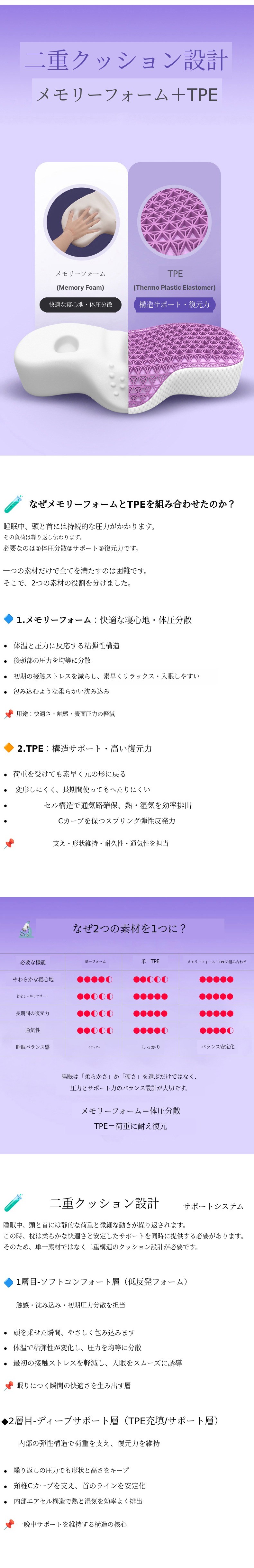 1. 🛏️ TPEとメモリーフォームの二重設計枕 - 頸椎Cカーブに合わせた人間工学設計です 2. 🌙 快適な睡眠と首のサポート強化 - 首の曲線に沿った支えと復元力のバランスです 3. 🎁 洗濯しやすいカバー付き - ホワイトとネイビーのカバーで清潔に保てます