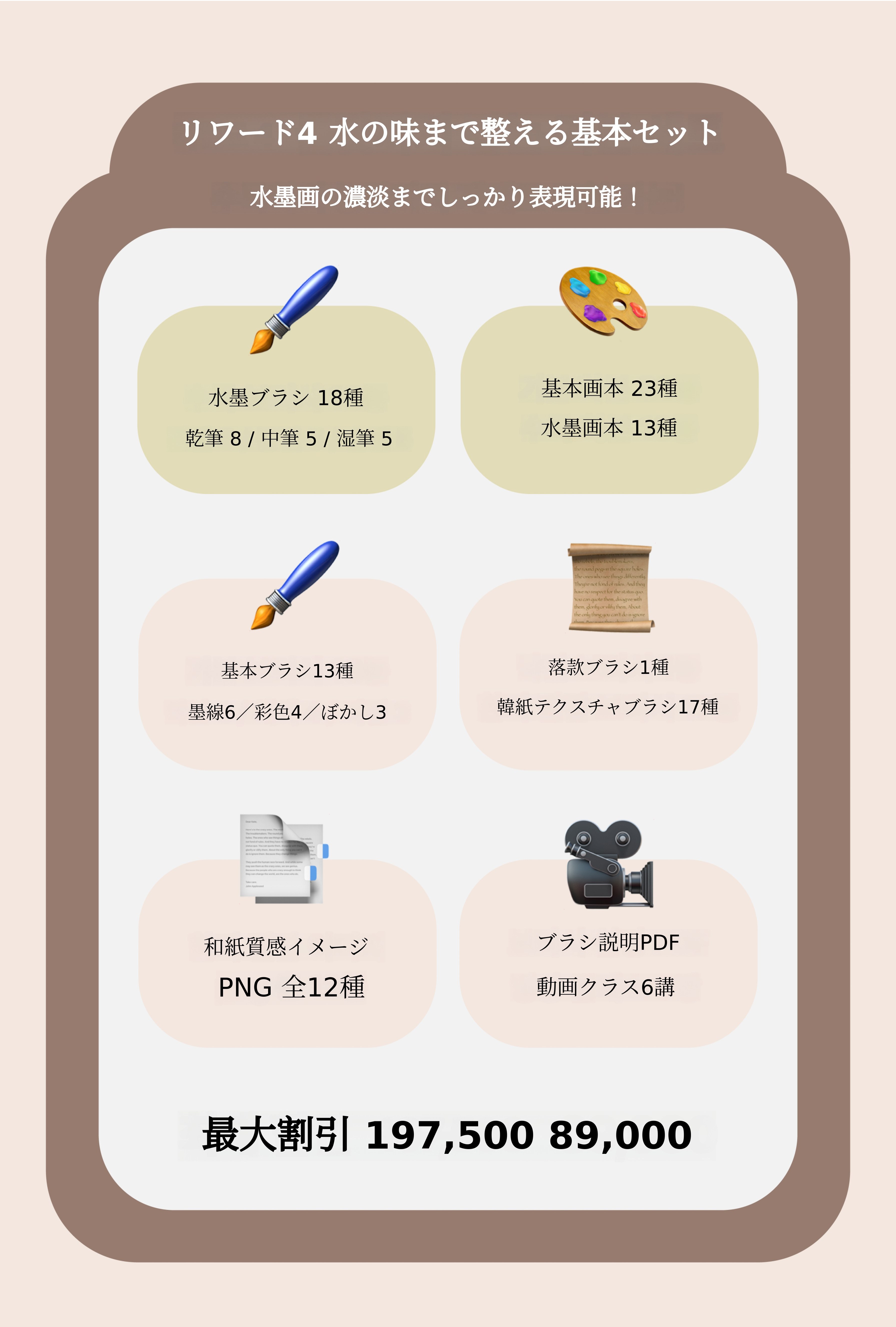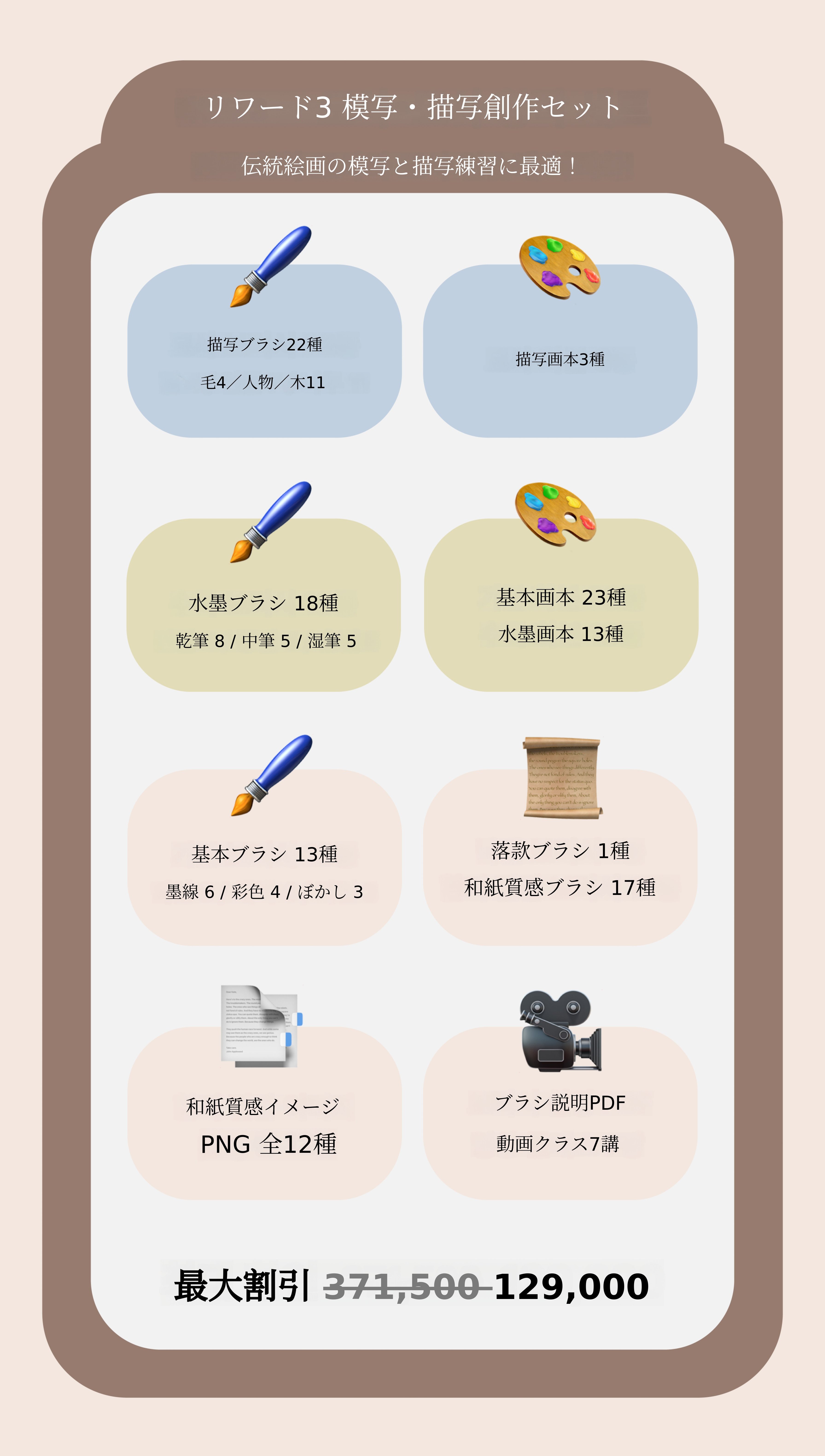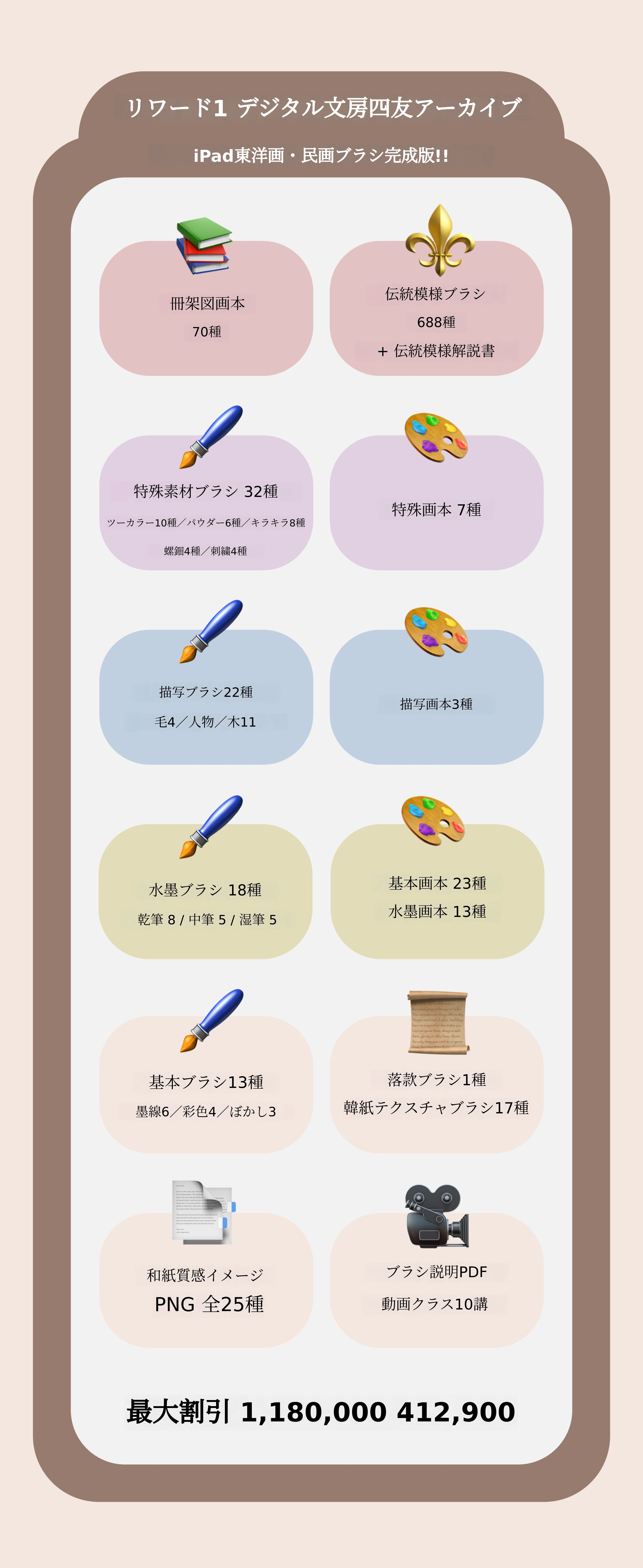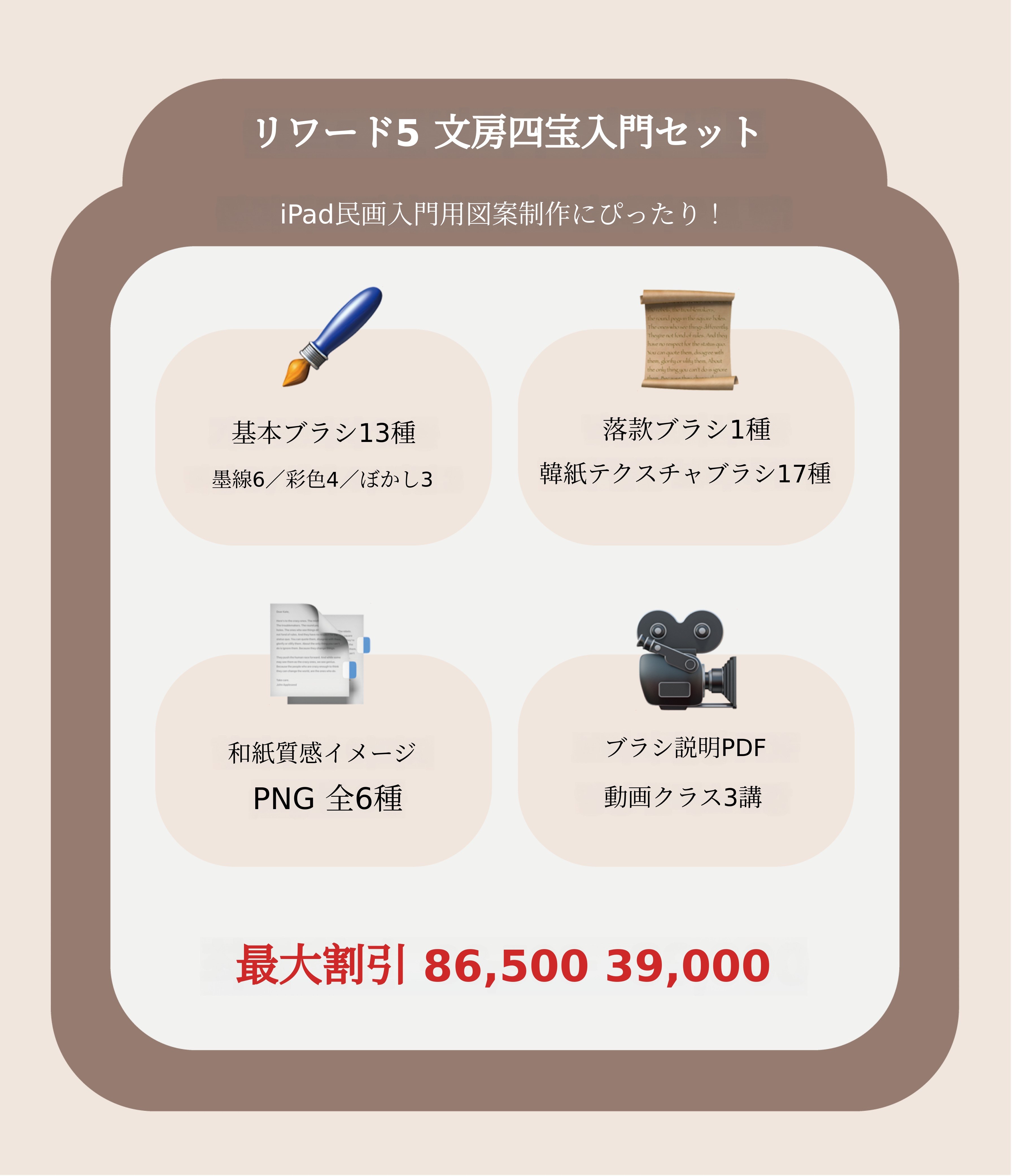 1. 🖌️ 伝統絵画デジタルブラシセット - iPad用プロクリエイトに900種以上のブラシを提供します 2. 🎨 伝統と現代の融合ツール - 墨や線、質感をデジタルで再現し教育コンテンツ付きです 3. 💸 割引と教育特典 - 動画クラスとガイドブックを含み最大55%割引です