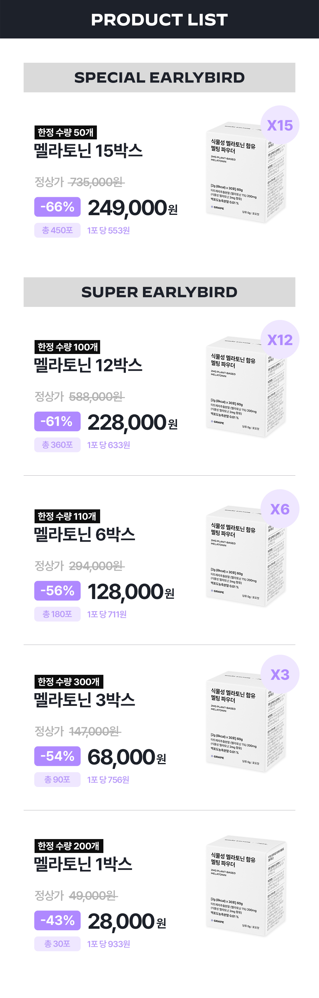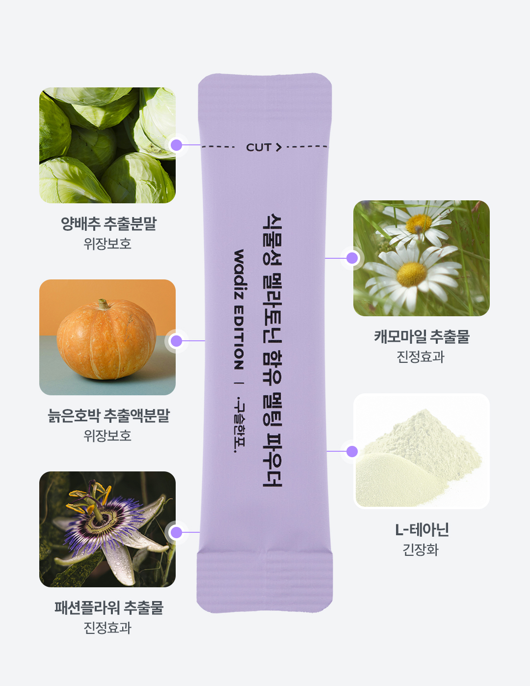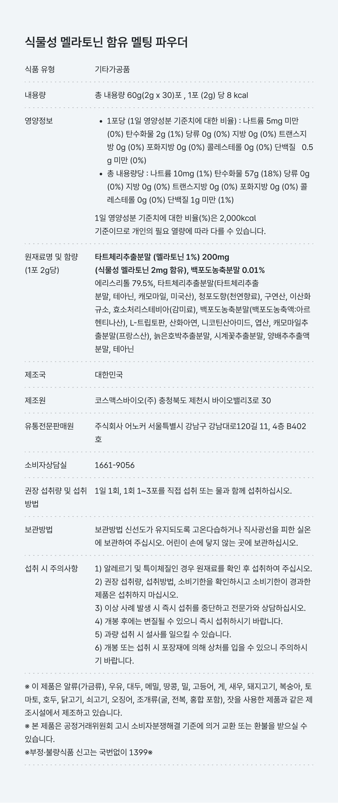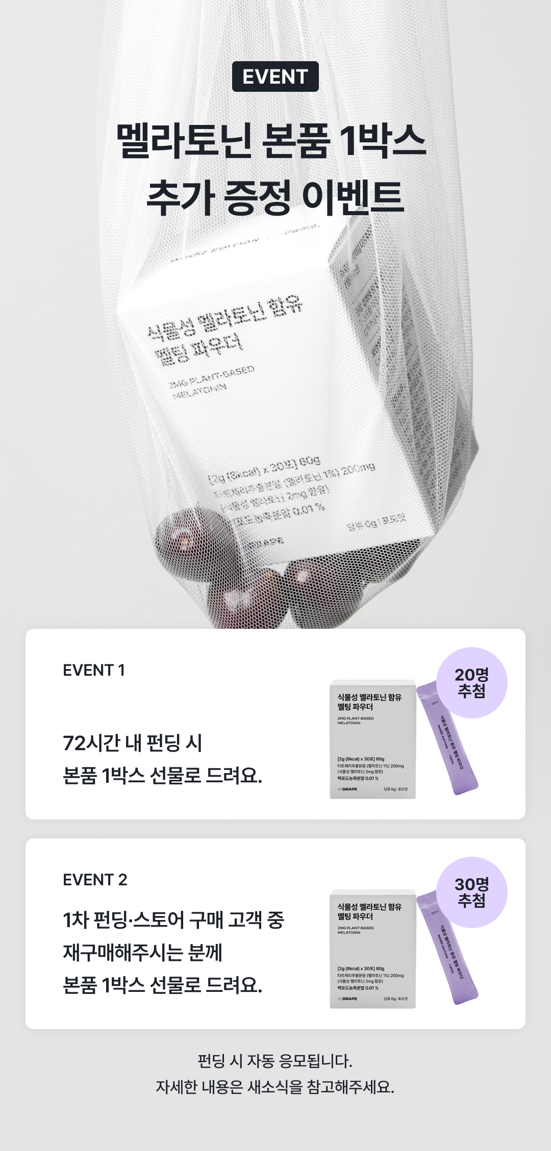 1. 🌙 植物性メラトニンメルティングパウダー - 14kgのタルトチェリー由来の高品質メラトニンを1包に 2. ⏱️ 5秒で速く溶ける - 超微細パウダーでいつでも簡単に摂取可能です 3. 🎁 限定数量と追加プレゼント - 72時間以内の支援で1箱プレゼントします