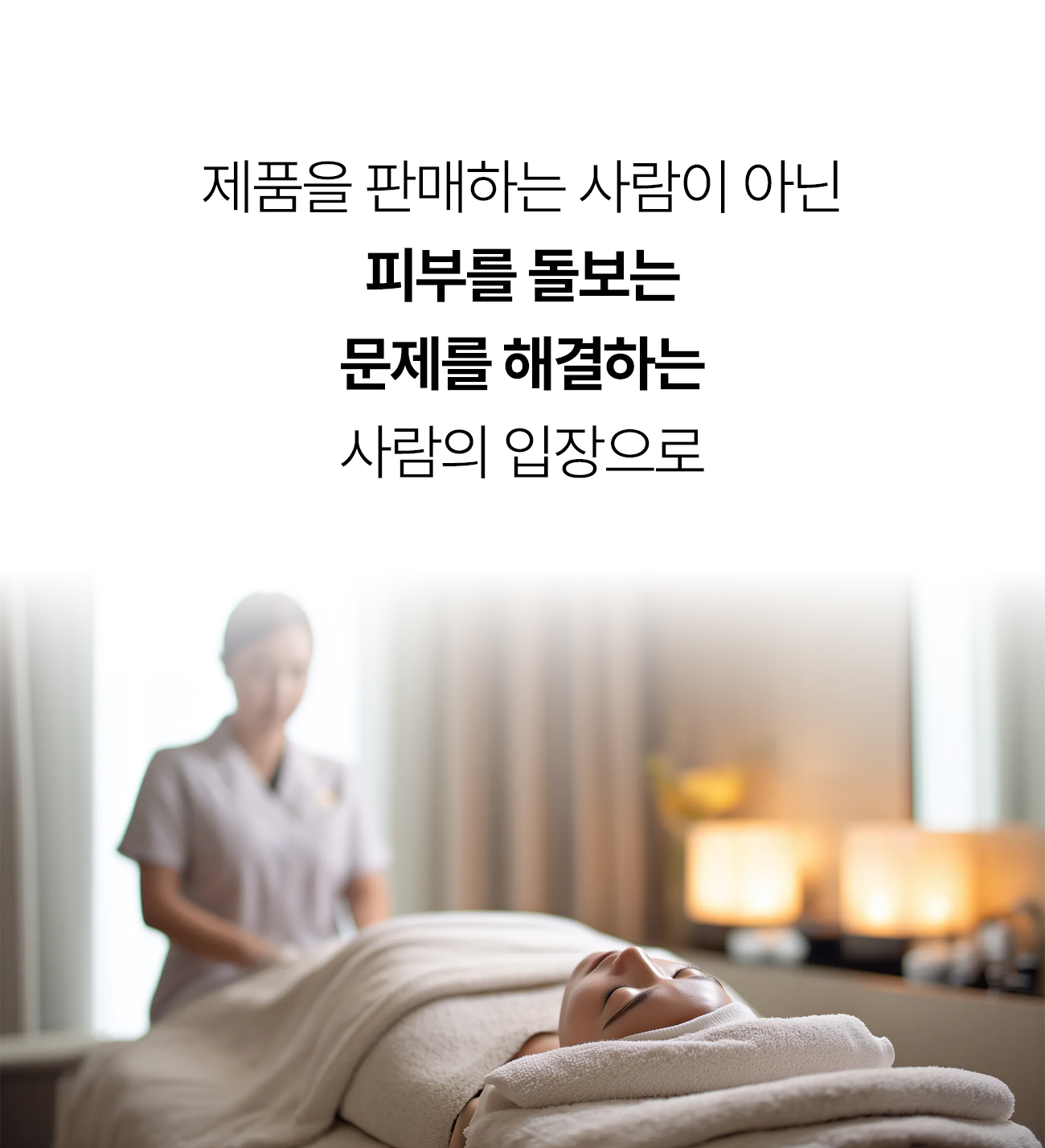 저는 20년 동안 피부관리 전문가로 살아오며 수많은 고객의 피부를 만나왔고, 그중 10년은 피부관리실을 직접 운영하며 현장에서 고객들의 고민을 가장 가까이에서 들어왔습니다. 수많은 화장품을 소비자 입장에서 써보기도 하고 손님들에게 피부관리 제품으로 써보기도 했지만, 오랜 세월 질리지 않고 매일같이 손이 가는, 피부에 진짜 도움이 되는 화장품을 찾는 일은 늘 어려웠습니다. 그래서 언젠가 직접, 고객이 믿고 오래도록 곁에 둘 수 있는 화장품을 만들어야겠다는 다짐을 하게 되었습니다.