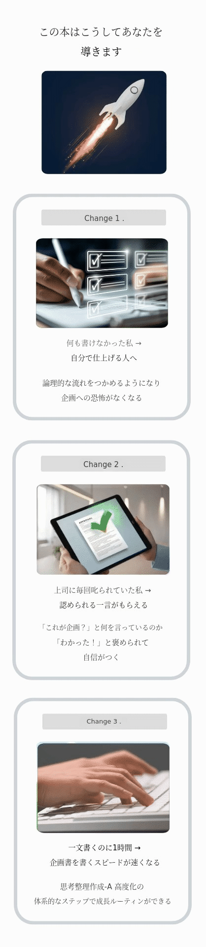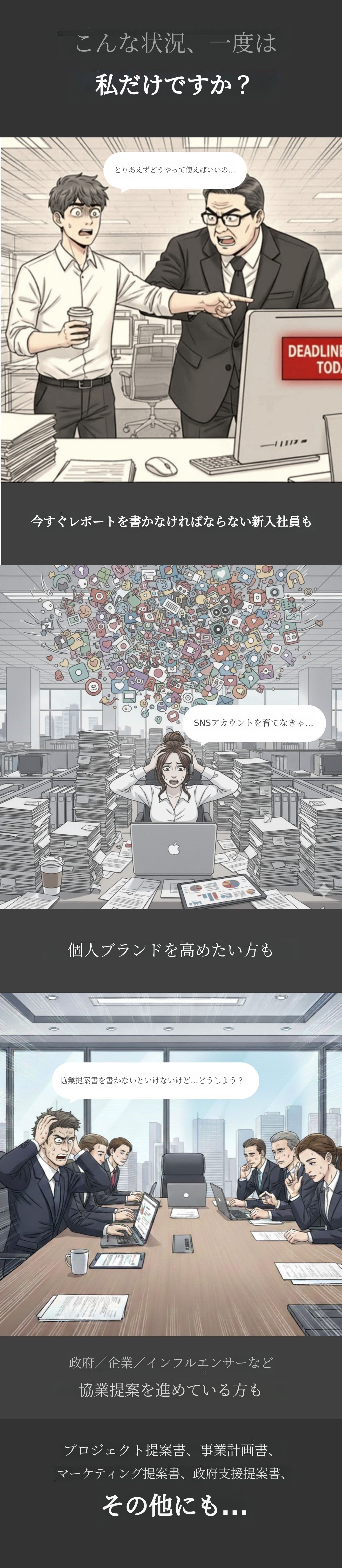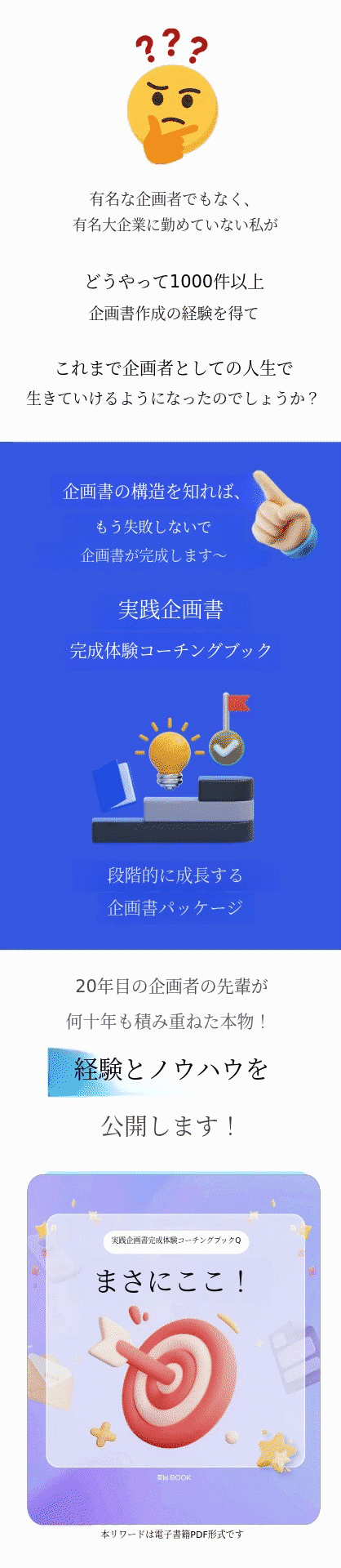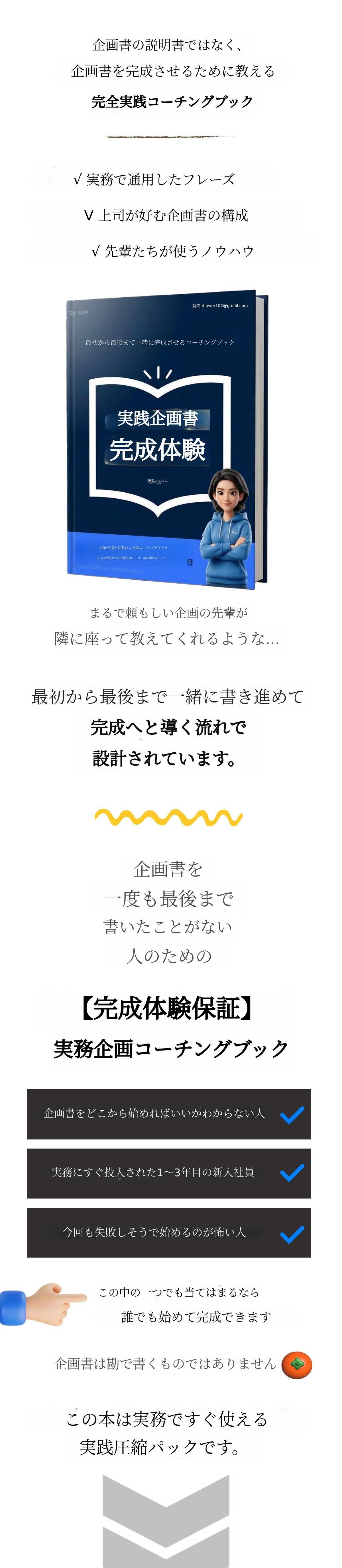 1. 📘 実践企画書完成コーチングブック - 企画書作成の開始から完成まで段階的に指導します 2. 🧩 論理的4段階構成法 - 問題・原因・解決・効果の流れで完成度を高めます 3. 🎁 限定パッケージ特典 - 電子書籍やテンプレートを含むセットです