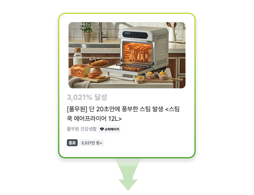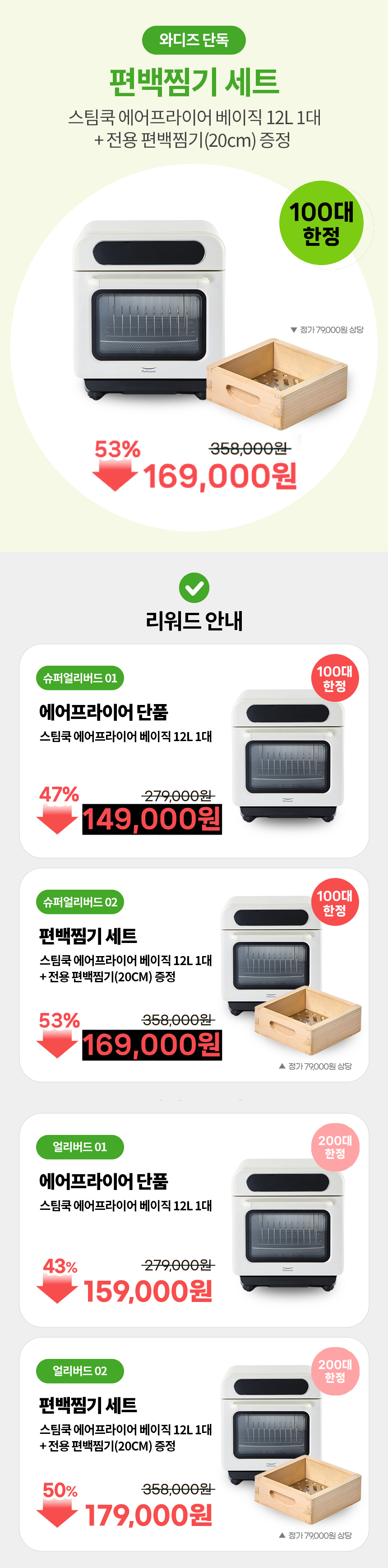 2025년 한해동안 꾸준하게 사랑받아온 풀무원 스팀쿡 에어프라이어가 12L가 다시 돌아왔습니다! 더 컴팩트해진 크기와 필수기능만 담아 스팀쿡 12L! 주방 공간을 크게 차지하지 않으면서 베이킹부터 오븐, 구이요리에 찜요리까지 완벽하게 가능한 풀무원 스팀쿡 에어프라이어 12L를 와디즈만의 단독 혜택으로 구성하여 찾아왔습니다. 기다려주셨던 서포터님들의 많은 관심과 참여 부탁 드립니다. 감사합니다.