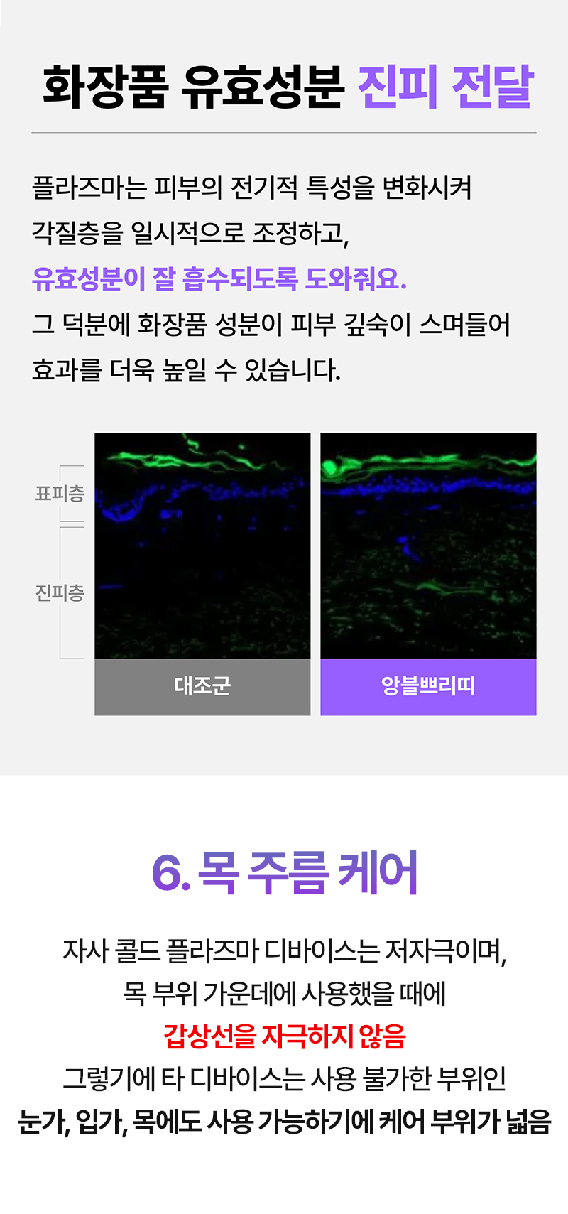 이때 플라즈마로 인한 세포의 열적 손상이나 배지의 pH의 변화는 관찰되지 않았다[6]. 이러한 결과는 상처치유 뿐만 아니라 피부 미용 분야에도 중요한 기초 연구결과라 할 수 있다. 즉 피부에 플라즈마의 주기적 처리는 피부세포를 자극시켜 진피층의 콜라겐을 증가시키고, VEGF의 분비 증대로 인해 신생혈관들이 피부세포들의 영양공급을 담당하여 노화 방지 효과를 기대할 수도 있다.
