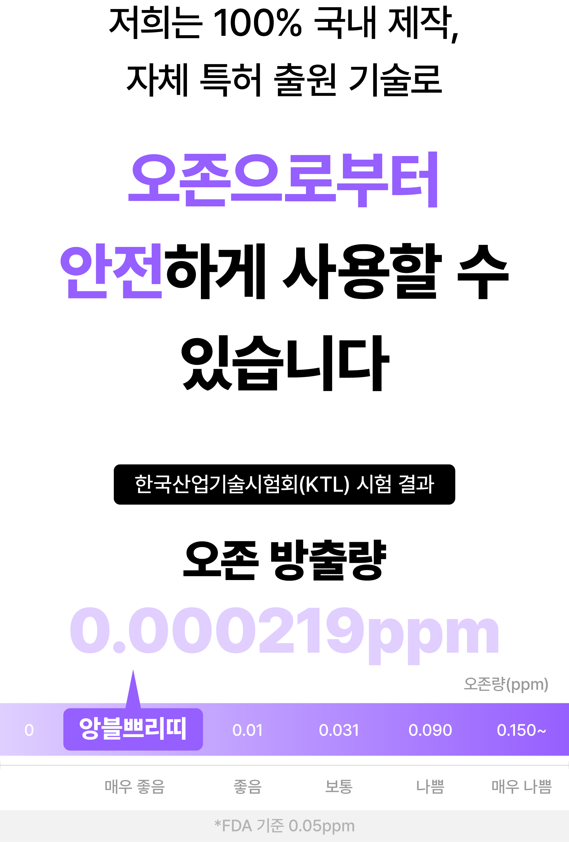 A. 코에 가까이 사용할 경우에는 미세한 오존 냄새가 올라올 수 있으나, 인체에 무해합니다. 오존 방출량 국제 기준 이하로 엄격히 통제하였으므로 안심하고 사용하셔도 좋습니다.
