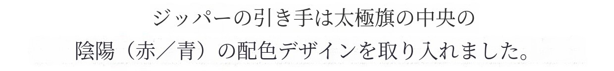 ジッパーの引き手は太極旗の中央の陰陽(赤/青)カラーのデザインにしました。