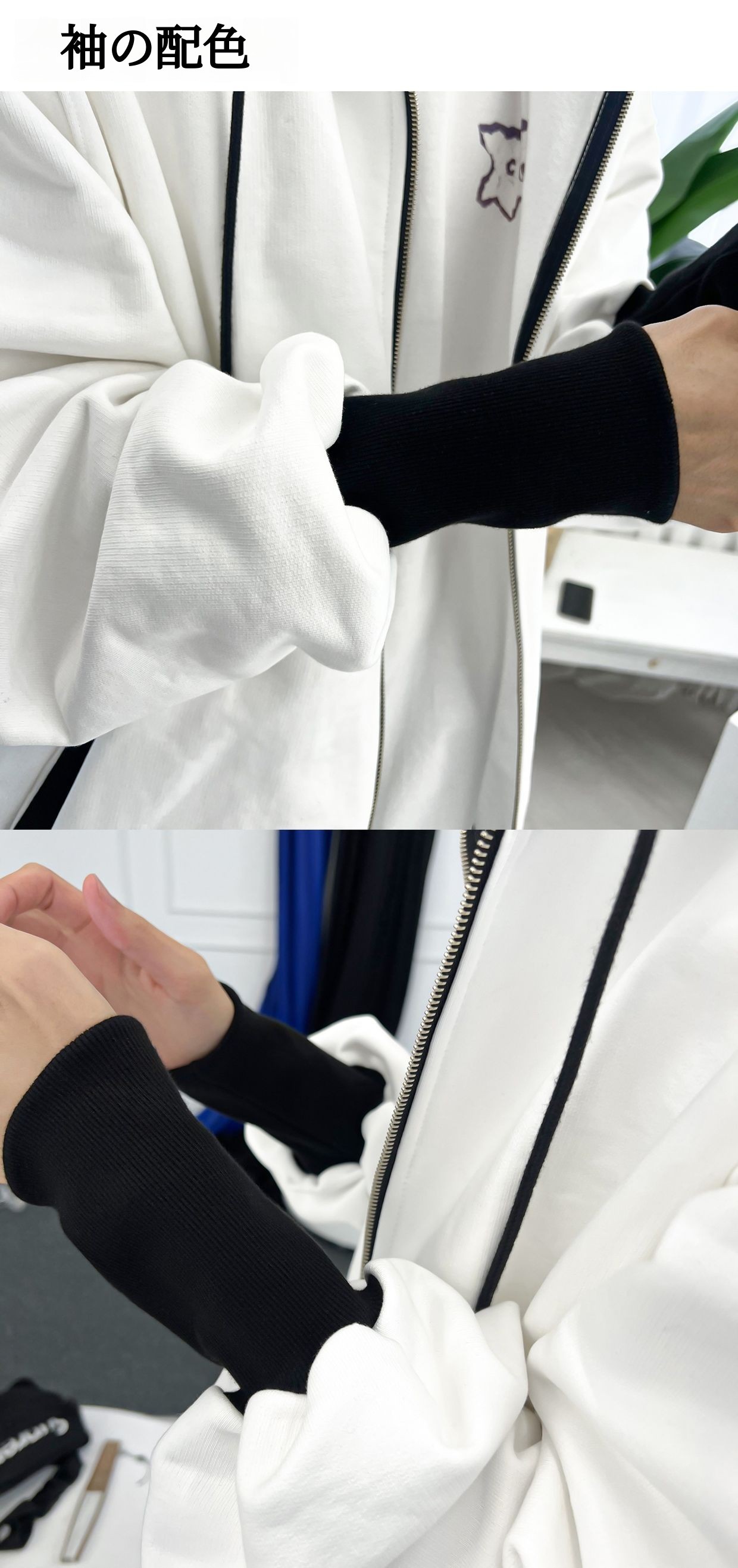 武官服の袖をモチーフに製作された袖付きフードジップアップが