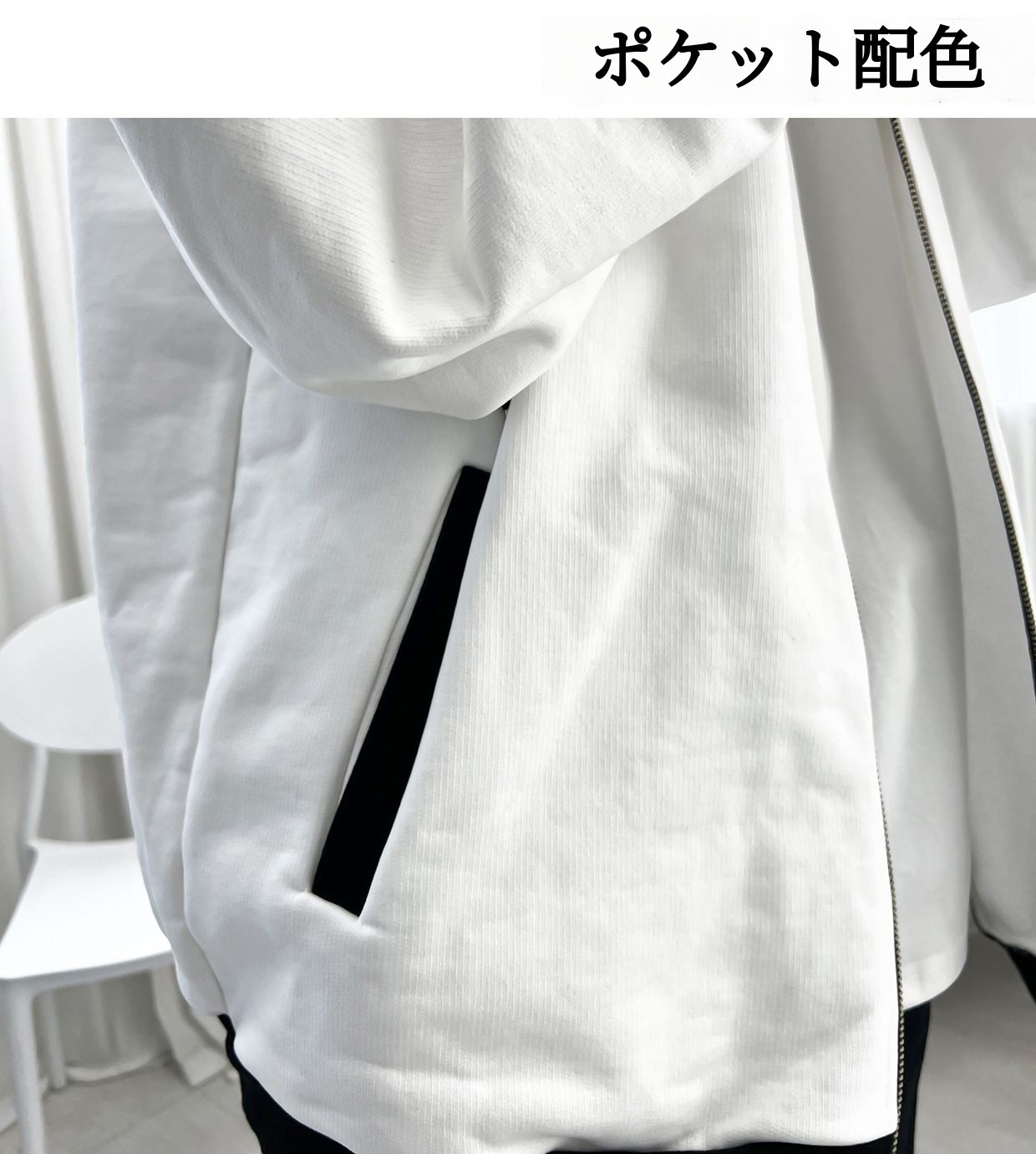 袖トスのリブ、裾、両側のグッチポケット(玉縁ポケット)には全体の色と反対の配色を施しました。サンプル初期デザイン時には太極旗をイメージし、ホワイトカラーにブラックの配色を加えて、乾坤坎離を象徴的に取り入れました。