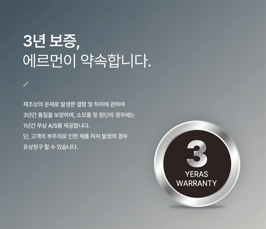 리워드 수령일로부터 3년간 무산 A/S를 지원하며 제품의 제조 불량으로 인한 A/S는 전액 메이커가 부담합니다. 단, 서포터의 과실로 인한 제품 및 포장 훼손, 사용 후 단순 변심으로 인한 반품은 불가합니다.