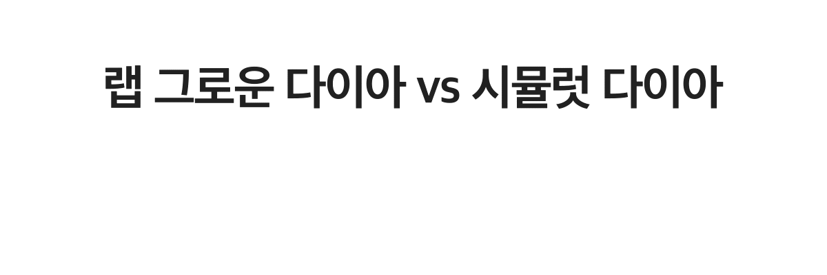 랩그로운 다이아몬드는 작은 다이아몬드에 실제 다이아몬드의 원소를 합성시켜 진주가 자라듯 크기를 키우는 방식으로 생산되기에, 천연 다이아몬드와 원소성분과 분자구조가 똑같은 보석임에 반해, 시뮬럿 다이아는 광택과 형태의 유사성으로 인해 다이아몬드의 모조품으로 많이 쓰이지만, 사실은 원소 성분 자체가 전혀 다른 별개의 스톤입니다. 시뮬럿 다이아로 불리우는 스톤으로는 큐빅, 모이사나이트 등이 있습니다.