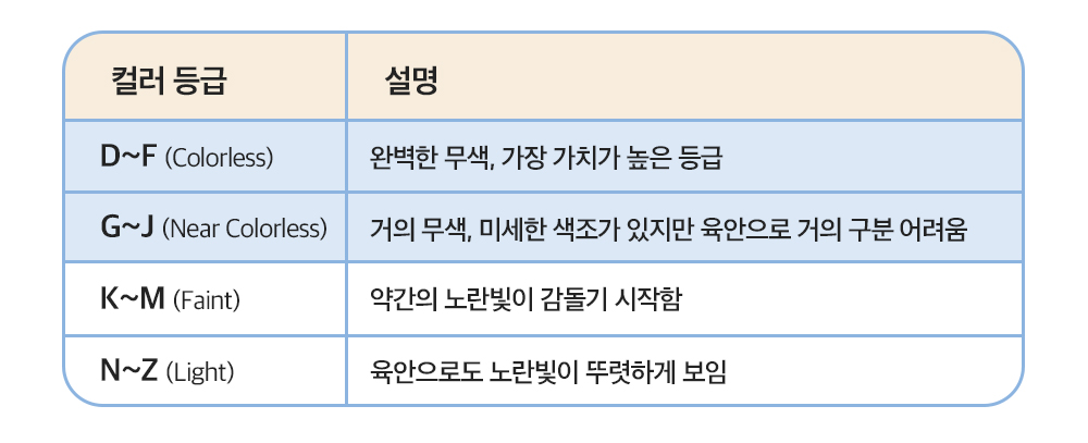 다이아몬드는 무색(Colorless)에 가까울 수록 더 아름다운 광채를 냅니다.