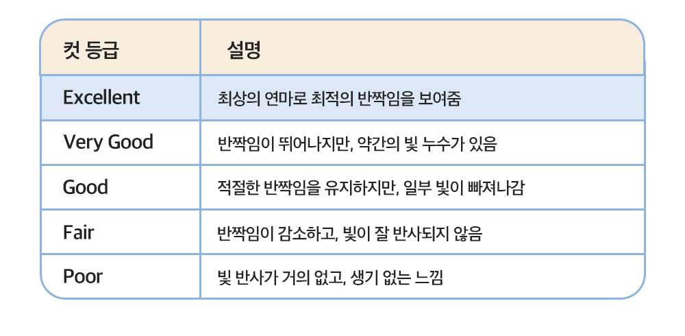 컬러와 투명도가 최고 등급이라도, 컷팅이 안 좋을 경우 빛 반사가 부족해 어둡게 보이는만큼, 연마 품질은 매우 중요합니다.