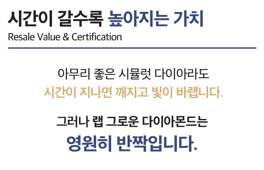 시간이 지남에 따라 빛이 변하는 유사석과는 달리, 다이아몬드 씨드 이외에 다른 물질이 들어가지 않아, 몇 세대를 지나도 변하지 않는 빛을 간직한 가치 있는 다이아몬드입니다.