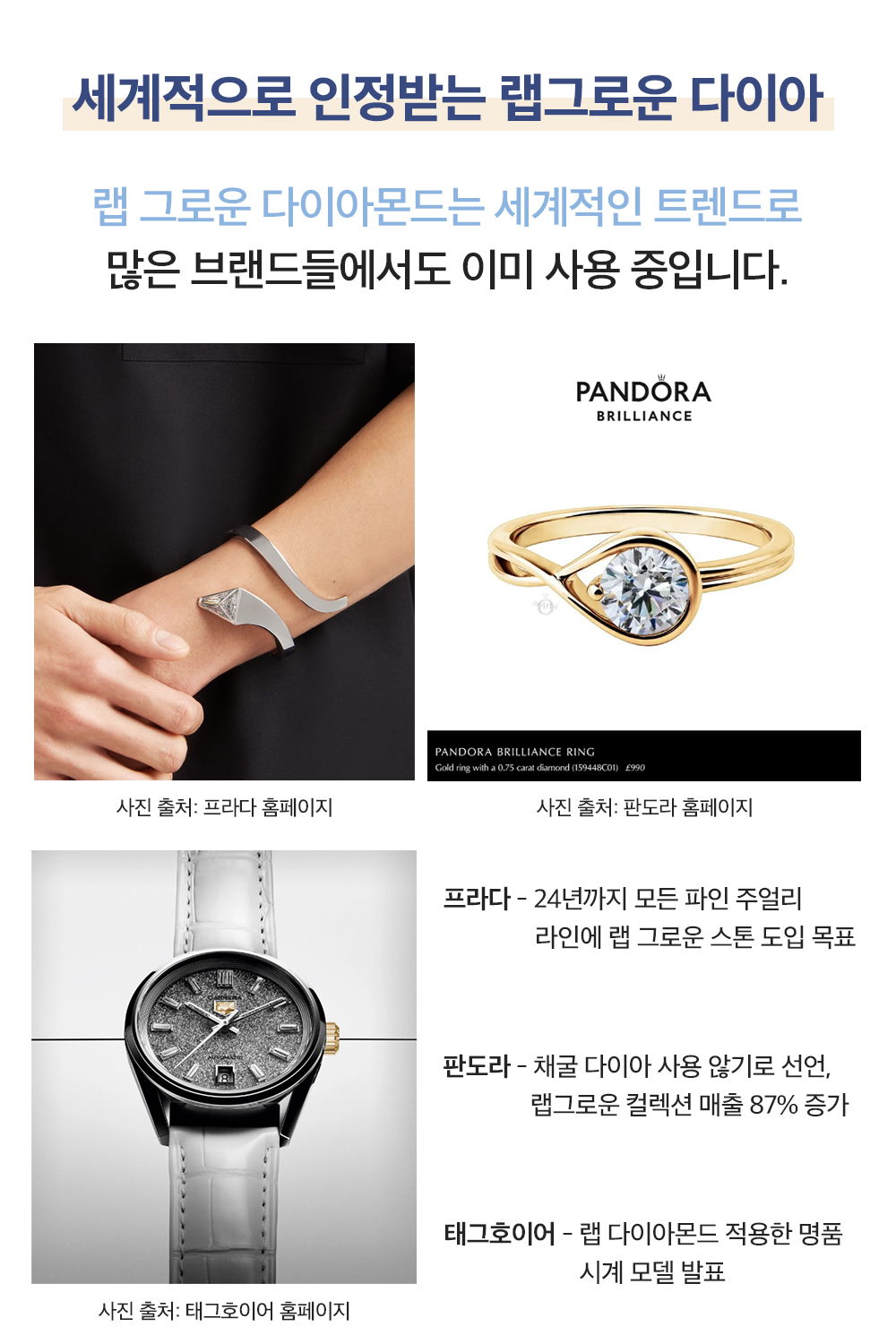 이러한 글로벌 명품 브랜드들의 랩다이아몬드 도입은 랩다이아몬드의 품질과 가치를 인정하는 동시에, 지속 가능성과 윤리적 소비를 중시하는 현대 소비자들의 니즈가 반영되어있음을 파악할 수 있습니다.