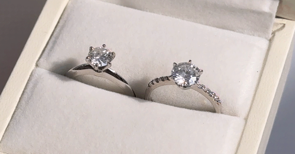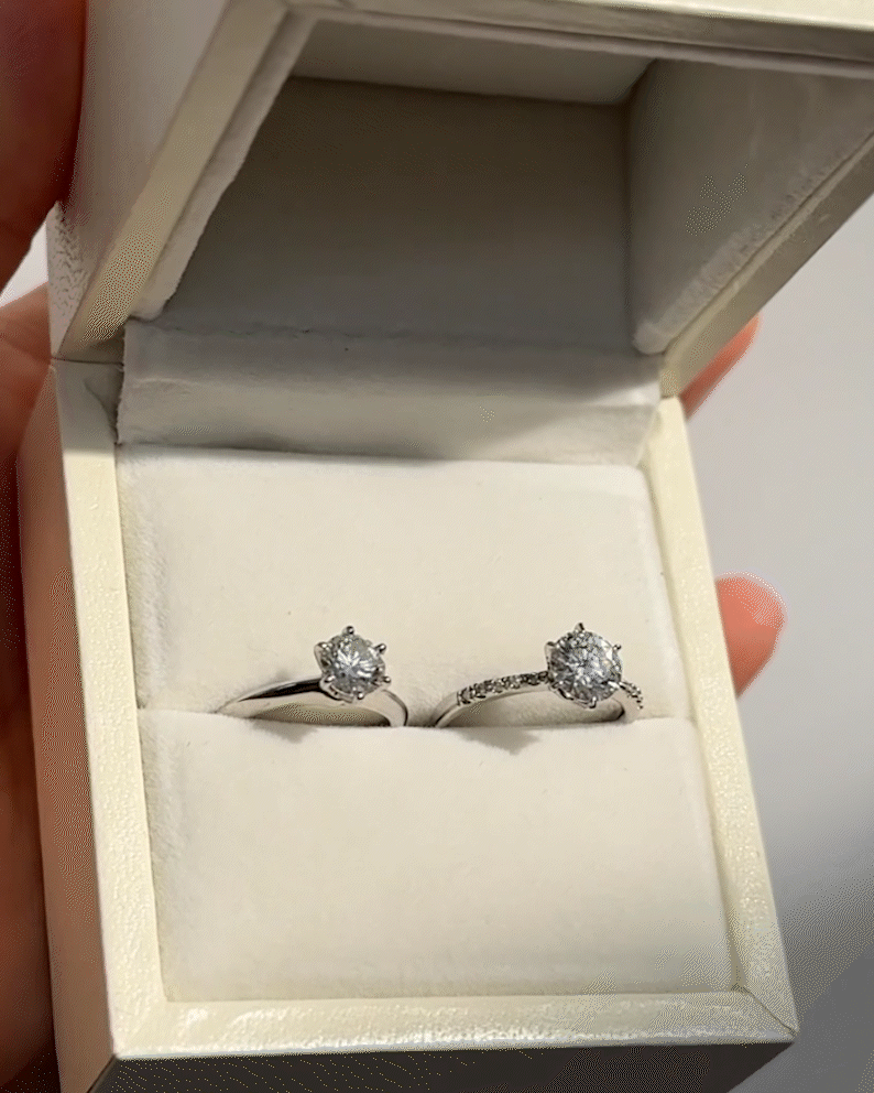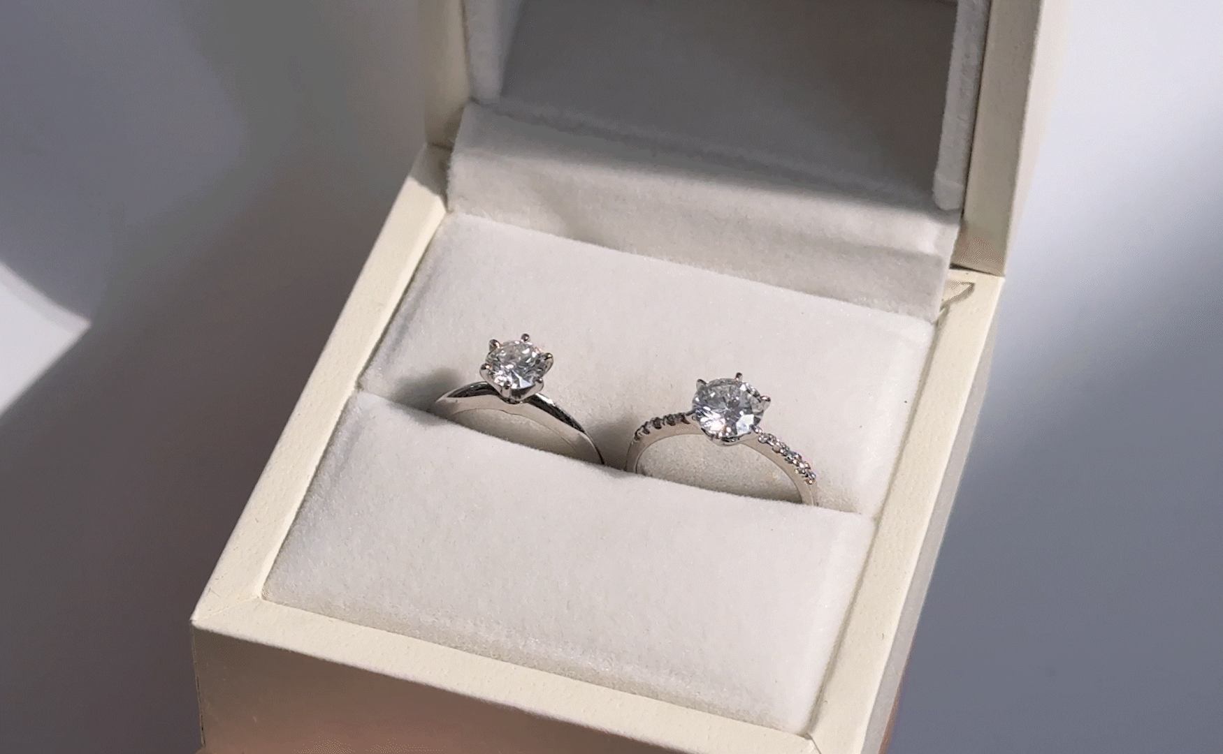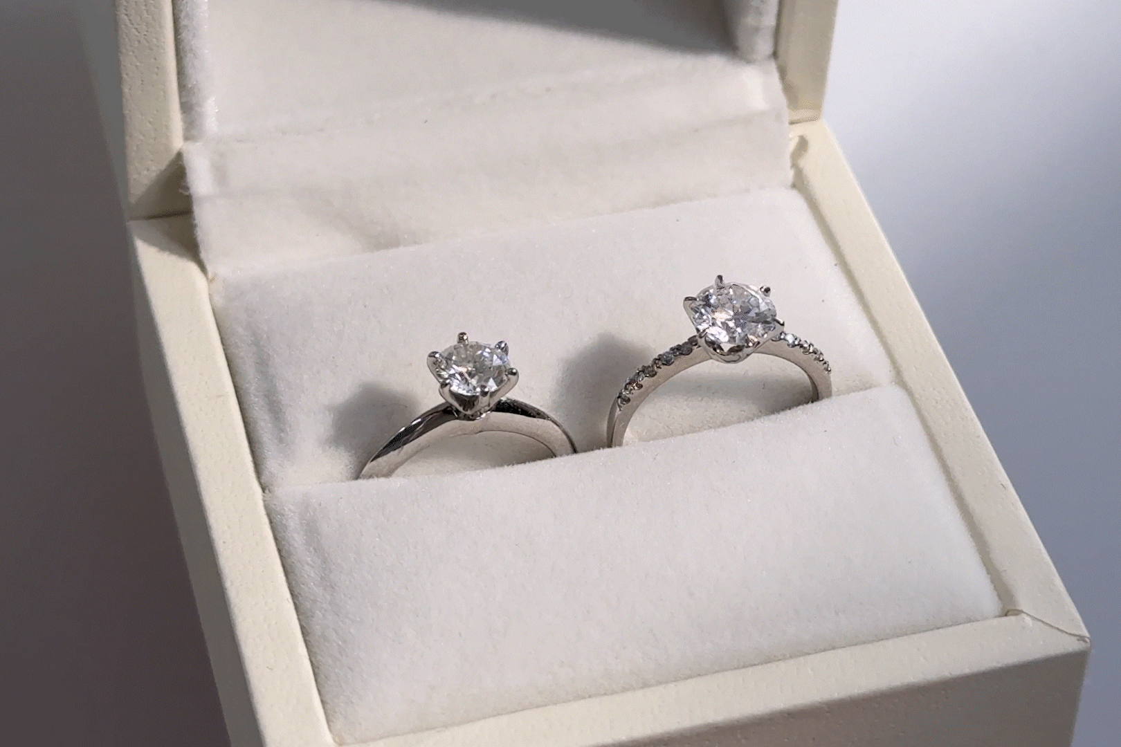 왼쪽은 티*니의 8부 다이아몬드 반지, 오른쪽은 J.Éterna의 1캐럿 다이아몬드 반지입니다.