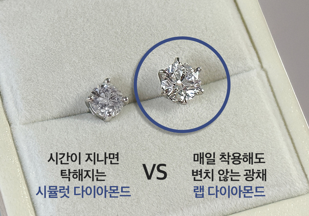 큐빅과 같은 시뮬럿 스톤은 랩 다이아몬드와 비교 했을 때 광택과 반사율 부분에서 확연한 차이를 볼 수 있습니다.