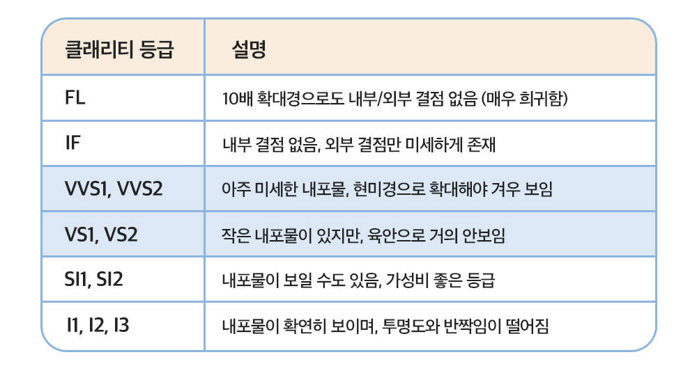 다이아몬드 내부의 불순물(내포물,인클루전)이나 표면의 결점(블레미쉬)의 정도로 평가되며, GIA 기준으로 아래와 같이 등급이 나뉩니다.