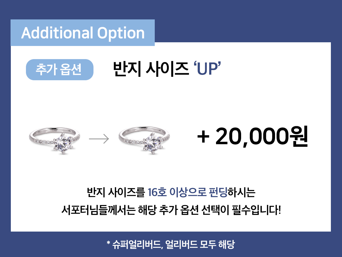 반지 사이즈가 16호 이상일 경우 추가 금액이 발생됩니다. 반드시 추가 옵션을 함께 펀딩해주세요!