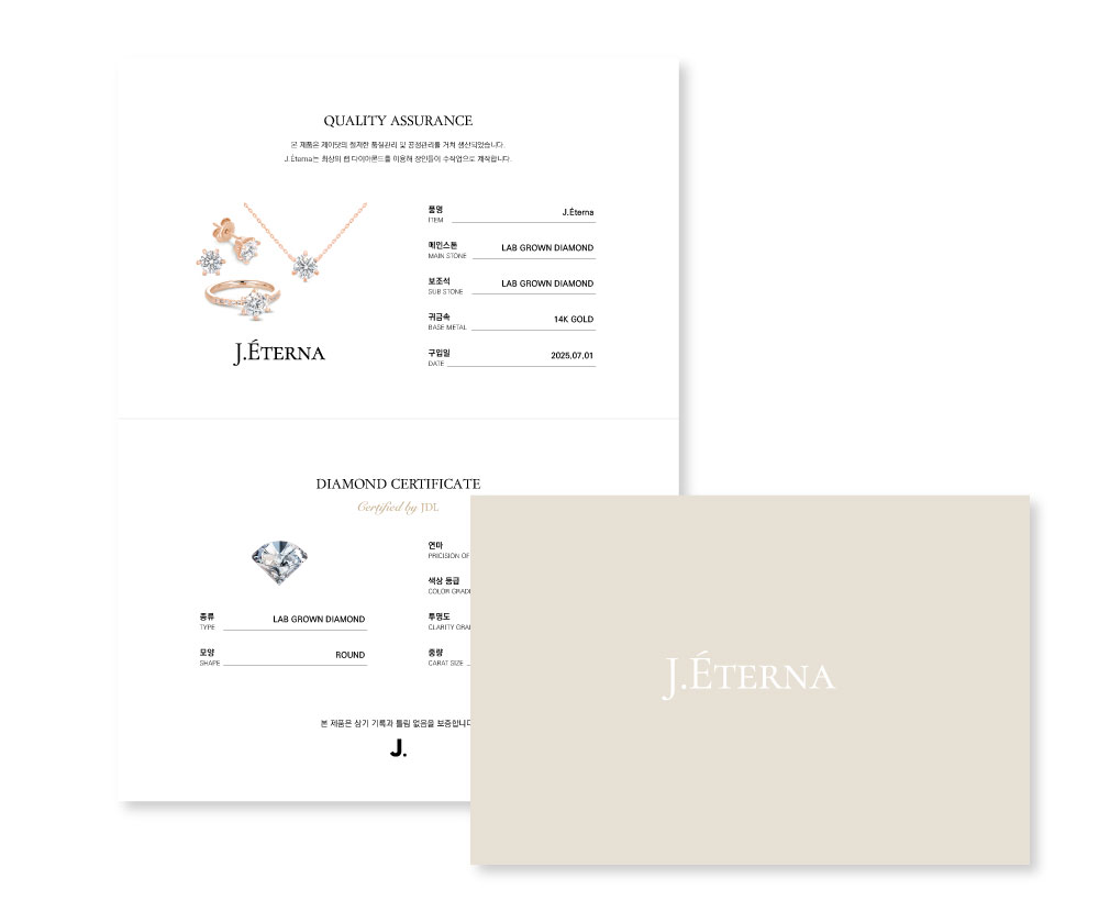패키지 구성에 기본으로 포함된 보증서는 랩 다이아몬드를 제작한 랩에서 전문가의 검증을 통해 제작한 제이닷 자체 발급 보증서입니다.