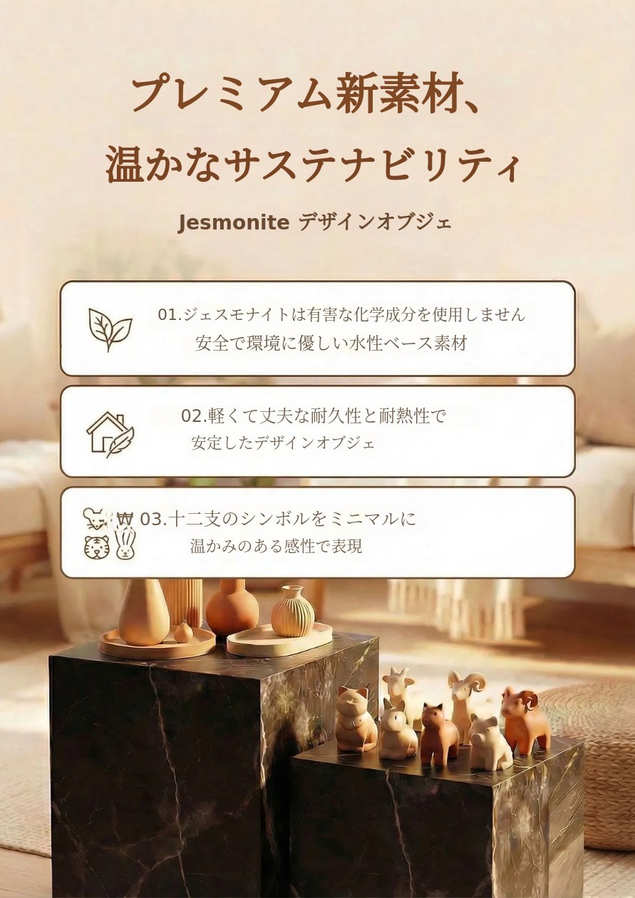 プラスチックではなく、ジェスモナイト(環境に優しい水性ベース素材)で製作しました。