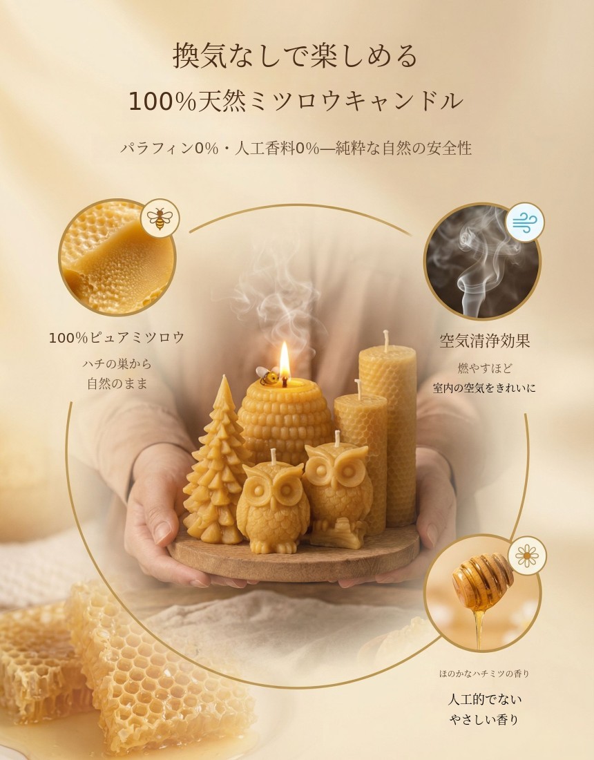 蜜蝋はミツバチが巣を作る際に自然に生み出す物質で、人工香料や石油系成分ではない自然由来の素材です。昔からろうそく、薬材、工芸に使われてきて、燃焼時にすすが少なく、光が安定しているのが特徴です。