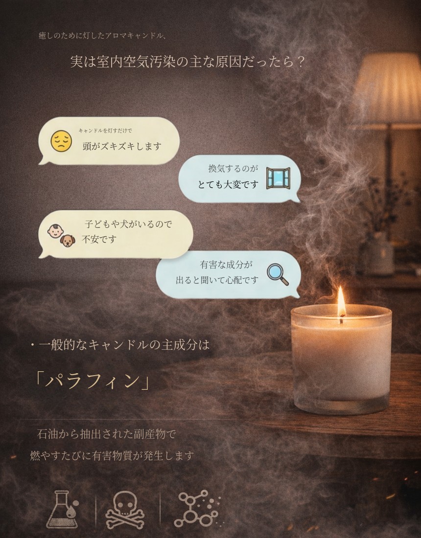 市販のキャンドルのほとんどは石油系パラフィンや人工香料を使用しています。