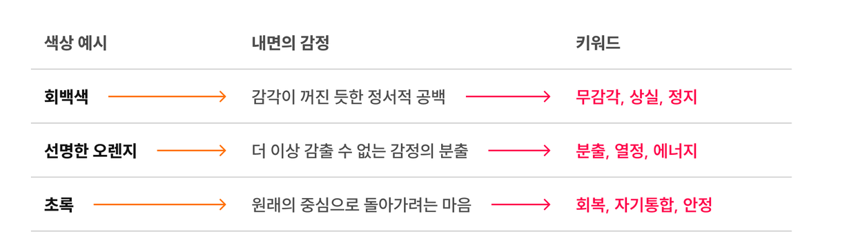 (예: 회피, 기대, 피로, 거리두기)를 색과 키워드로 만나게 되죠.