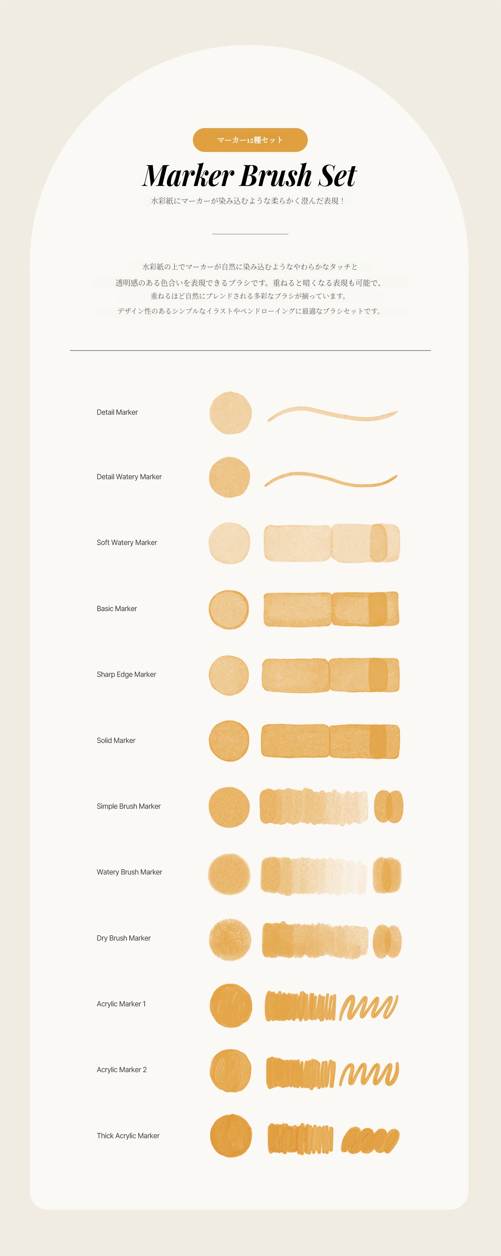 透明感と鮮やかな色味が特徴のマーカー風ブラシ12種です。