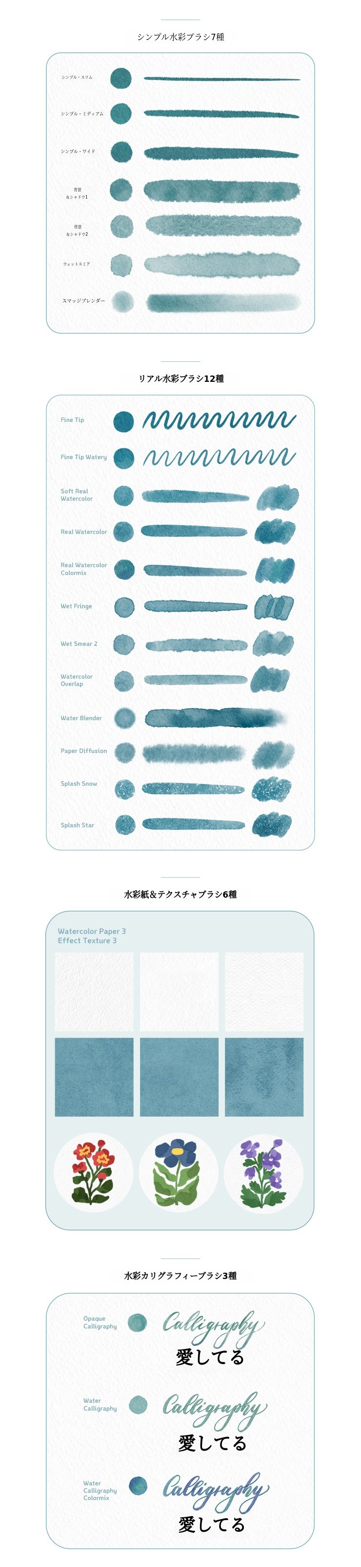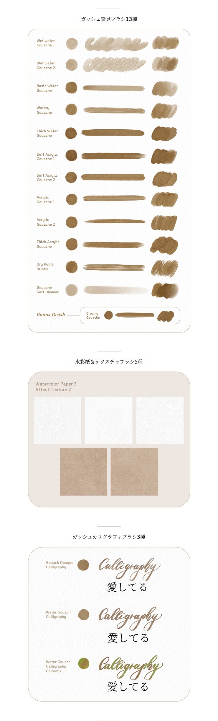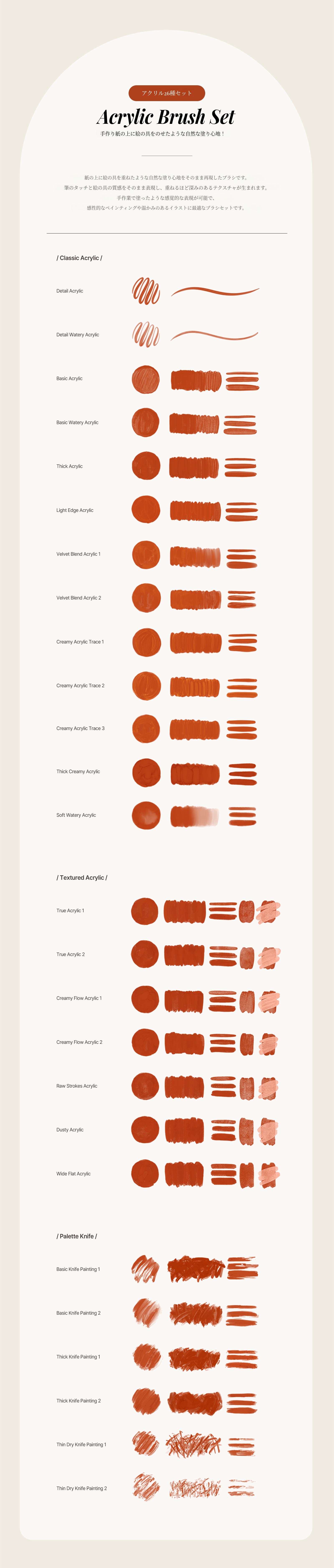 手作業アクリルの質感と表現方法をそのまま再現した26種類のブラシです。