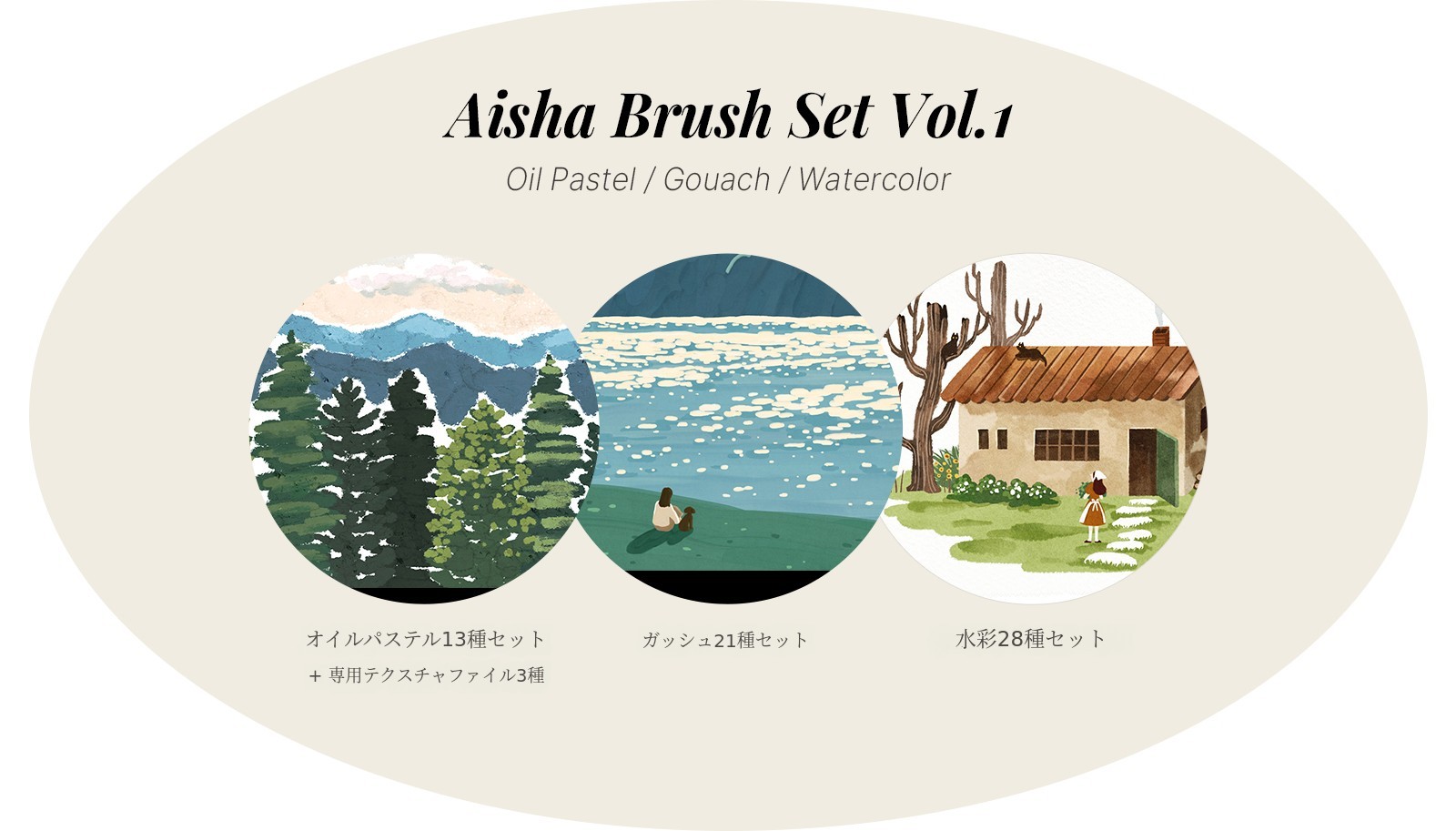 Aisha Brush Set Vol.1 オイルパステル、水彩、ガッシュブラシは