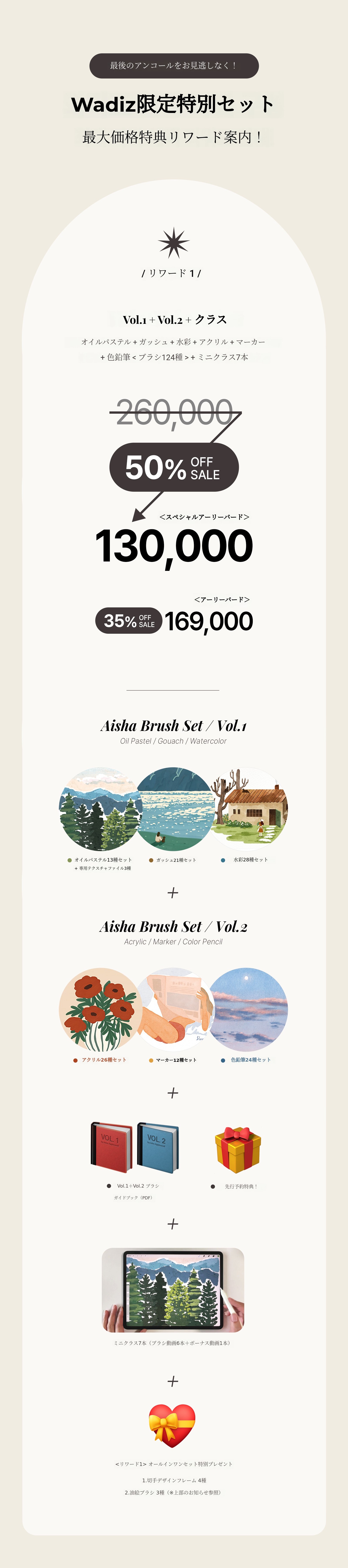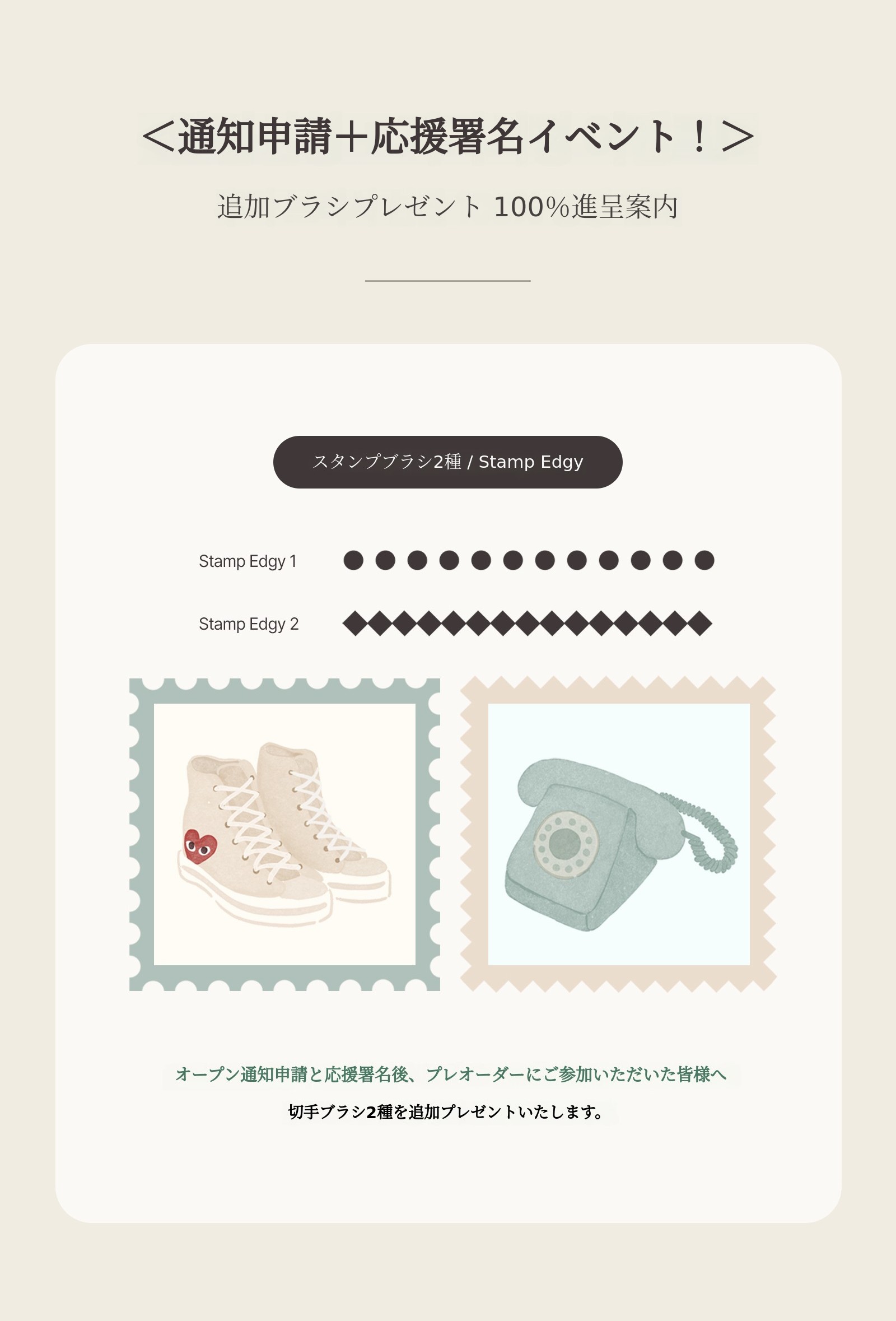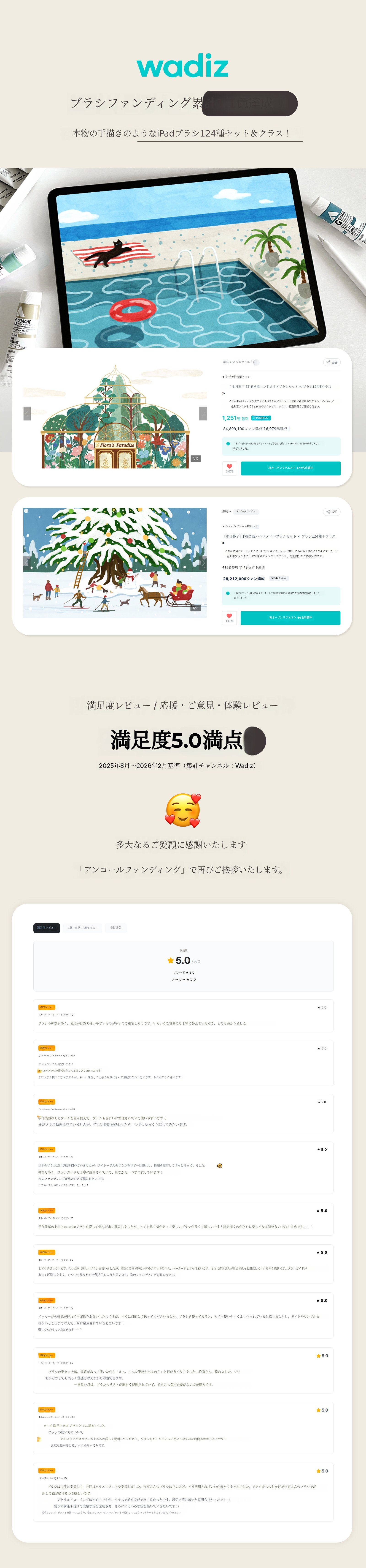 今回のWadizプレオーダーを通じて、より多くの方がProcreateで手描きのように自由で癒される作業を体験していただければと思います。完成度の高いブラシとともに追加構成としてミニクラス動画もご用意しましたので、感性あふれる作品をぜひ完成させてみてください。