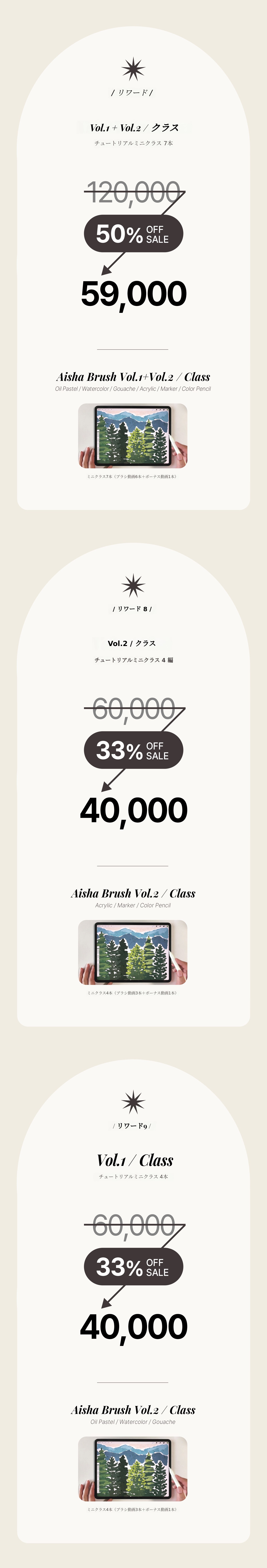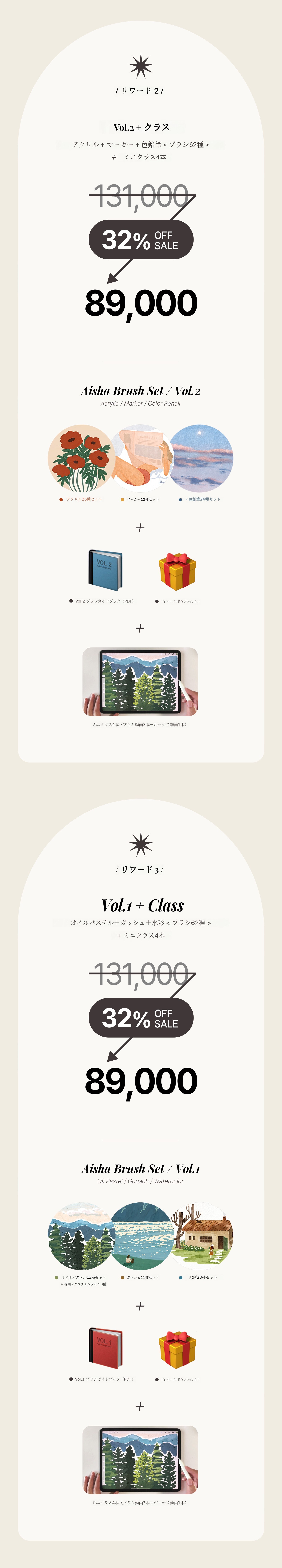 - ブラシセットおよびガイドブック、ミニクラス動画はGoogleドライブのダウンロードリンク形式で提供されます。