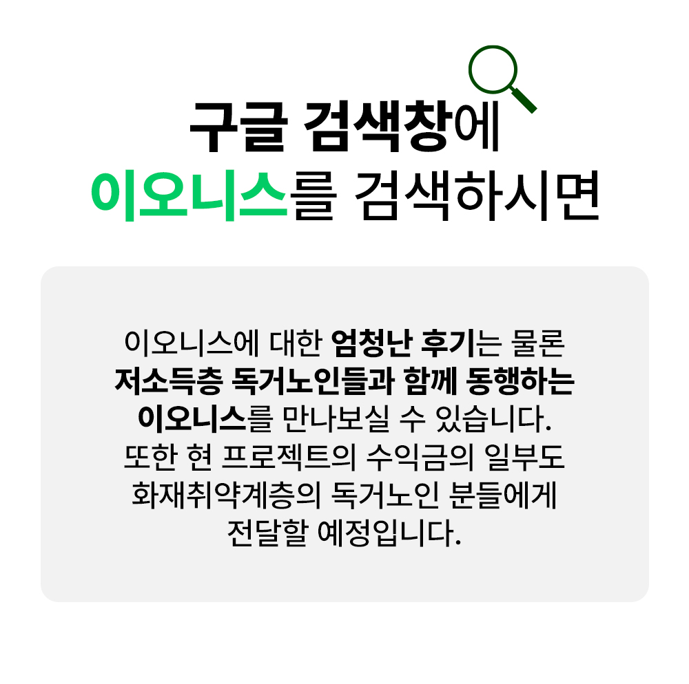 집에서나 사무실에서나 걸어 다니면서나 어디서든 사용할 수 있는 웰빙패밀리 웨어러블 공기청정기를 와디즈를 통하여 한층 업그레이드된 리워드로 선을 보이는 이번 펀딩을 통해 확보된 자금은 리워드 생산과 글로벌 시장 진출을 위한 차세대 제품 개발은 물론, 공동모금회를 통하여 화재취약계층의 독거노인분들께 자동기부되는 사업에 활용할 계획입니다. 이오니스의 펀딩금 활용 현황은 뉴스 매체를 통해서도 확인 가능하시며, 새소식을 통해서도 펀딩 종료 이후 1년 이내로 공유드릴 수 있도록 하겠습니다.
