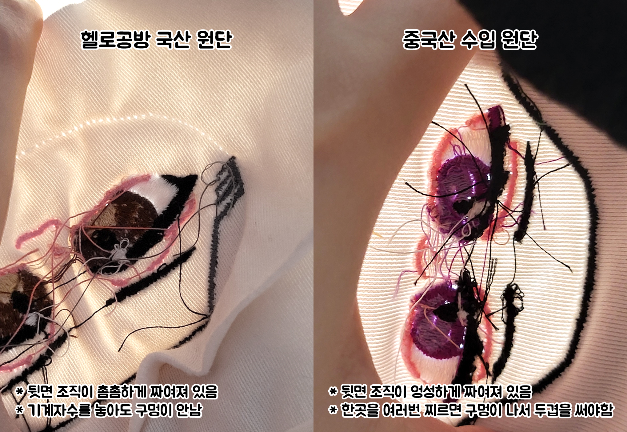 얇고 힘이 없어서 자수가 힘든 저가 원단이 아닌,