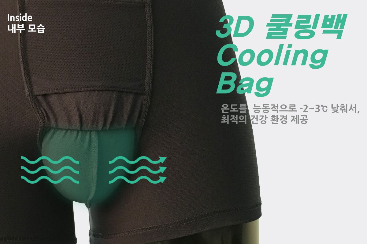 그리고 고기능성 극세구조 원단으로 제작된 3D 쿨링백(Cooling bag)은 음낭을 편안하게 감싸, 늘어짐을 방지하고 음낭의 온도를 능동적으로 -2~3℃ 낮춰서, 최적의 건강 온도를 찾아 줍니다.