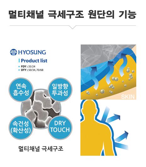 효성이 세계적인 첨단 기술력으로 개발한 아스킨 원사의 멀티채널 극세구조
