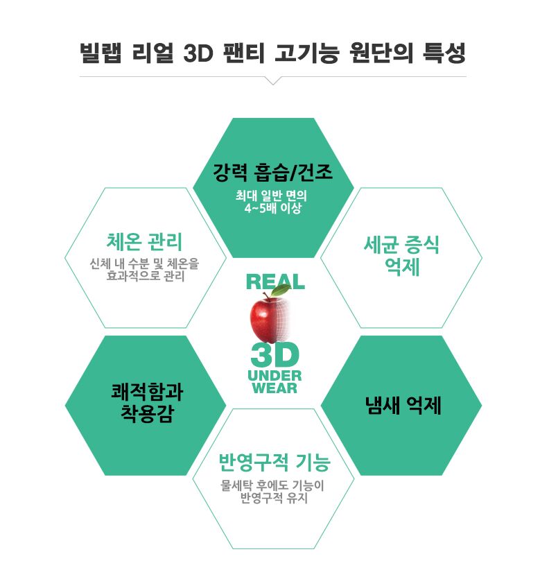 그리고 리얼 3D팬티 원단의 이러한 놀라운 기능성들은 수십번의 세탁 테스트 후에도 그대로 유지가 되었습니다. 리얼 3D 팬티의 기능들이 흡수유연제와 같은 약품 처리를 통해서가 아니라 원단의 물리적인 첨단 구조에 기반하였기 때문입니다. 그래서 세탁 후에도 그 기능이 반영구적으로 유지되는 것입니다.