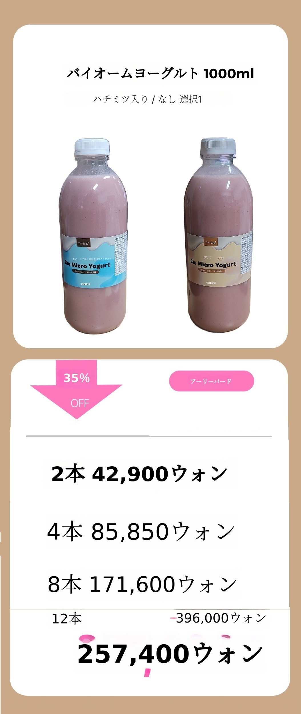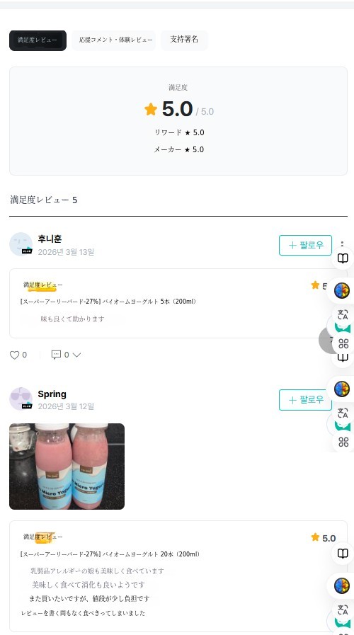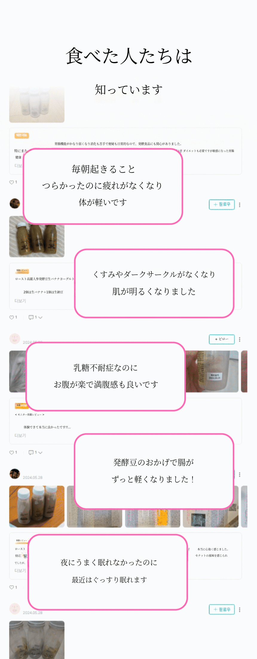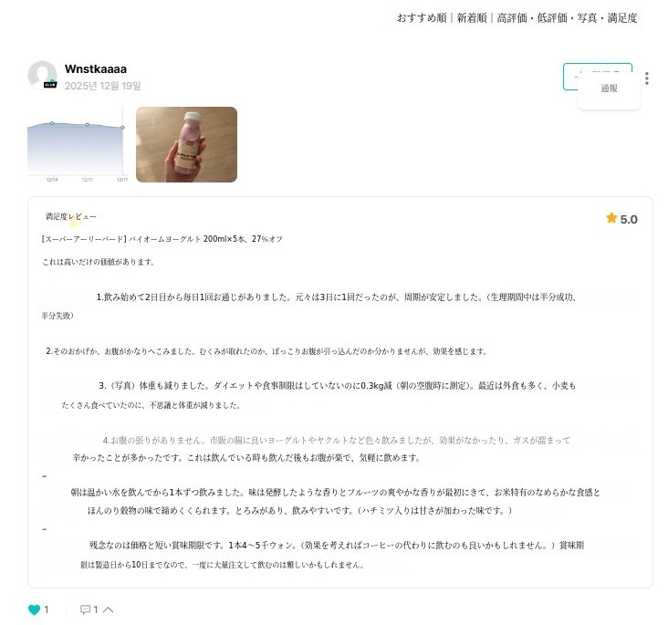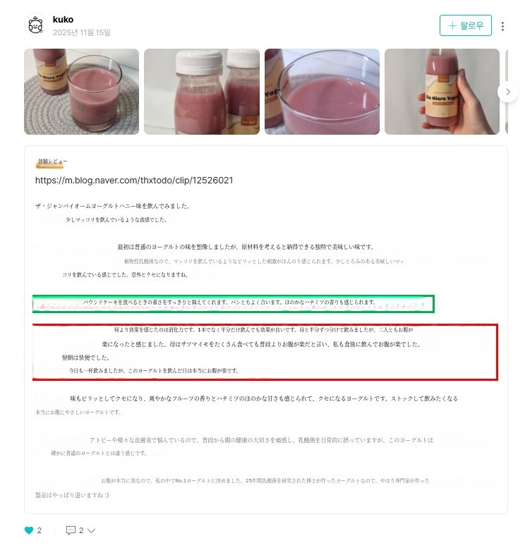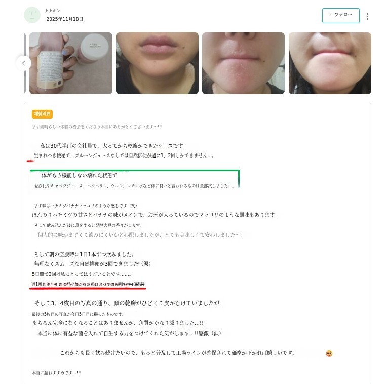 - 本当にこんなヨーグルトは初めてです。牛乳を使っていないヨーグルトなんて??本当に初めて聞くヨーグルトだったので、正直味や食感がどうなのか少し心配でしたが、いざ食べてみたら思ったよりずっとさっぱりしていて、お腹もとても楽でした! 私は普段腸が敏感で、普通のヨーグルトや乳製品を食べるとお腹が張る方なのですが、これはそういう感じがほとんどなくて、初日から確かに快適で良かったです。私が体験したバイオームハニーはほんのり甘くて、おやつのように食べやすかったです. 飲むタイプなので負担なくすっと飲めて、数日食べてみたらトイレに行くリズムも確かに楽になった感じがしました。お腹が楽になると、なんだかコンディションもあまり疲れ を感じなくなり、朝起きるときも体が軽い 感じでした。三日目になるとトイレにもちゃんと行けて、お腹が本当に楽でした. ㅎㅎ - ブリー