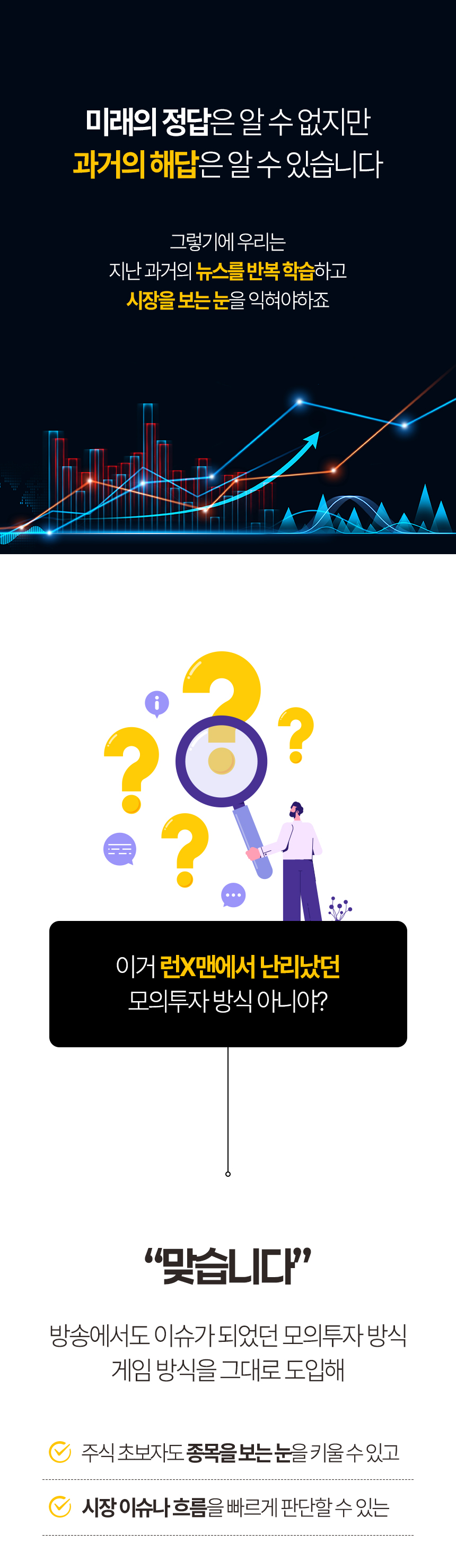 복잡한 이론 대신 짜릿한 게임 룰과 지난 10년의 실제 대한민국 주가 데이터를 결합해 모의투자를 할 수 있는 경험을 선물하고자 와디즈를 찾아오게 되었습니다.