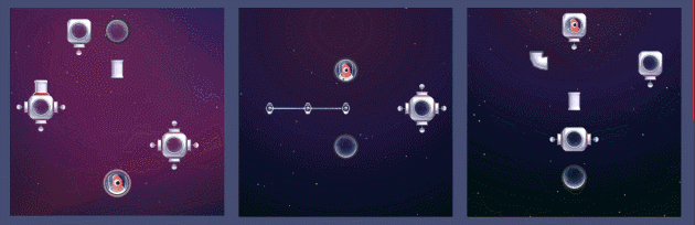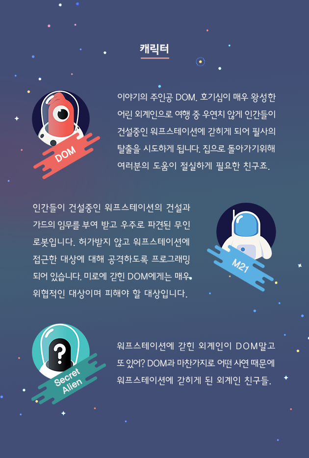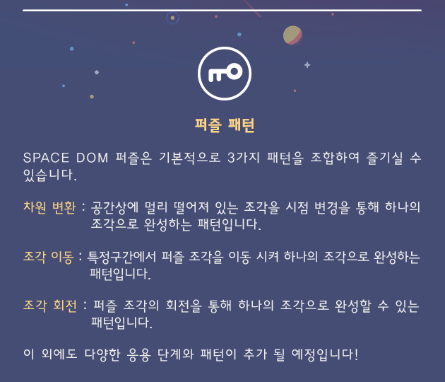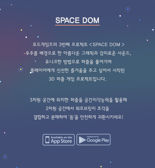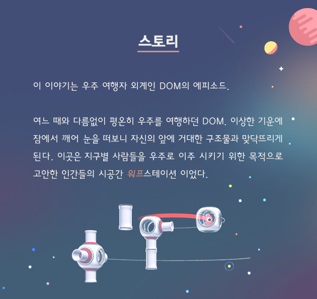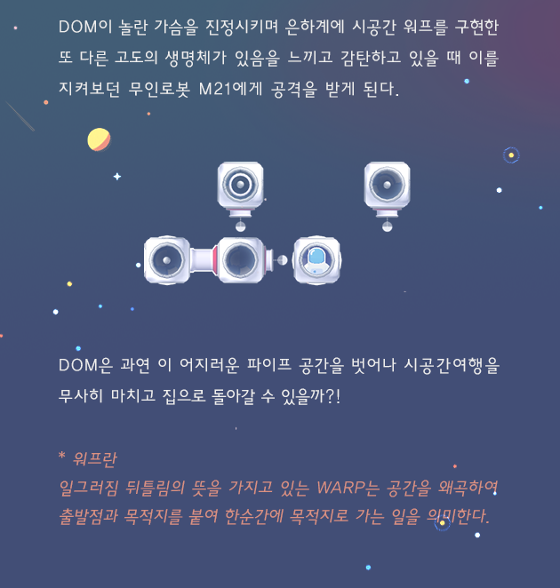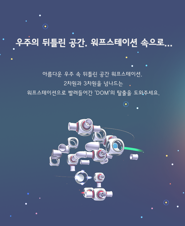 美しい宇宙に広がる歪んだ空間ワープステーション。2Dと3Dを行き来しながら、ワープステーションに吸い込まれた『DOM』の脱出を助けてください。