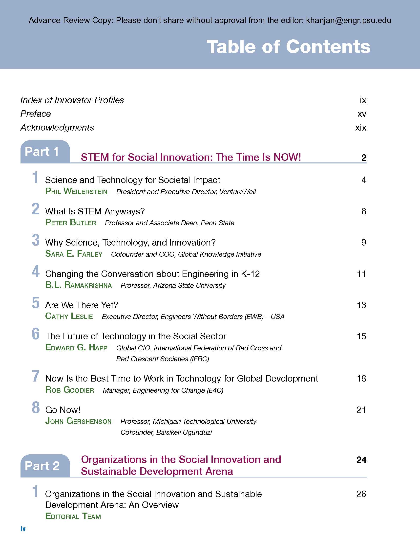 월드뱅크, 유니세프, 게이츠재단, 구글, 소셜벤처, 정부기관, 비영리단체, 학계, 민간기업에서 일하고 있는 100명의 STEM 사회혁신가들의 경력 프로필을 소개하고 있습니다. 아무 페이지나 펼쳐도 과학기술 전문성을 가진 사회혁신가들이 자신들의 역할, 임무, 이력 그리고 경력을 통해 깨달은 것들에 대해 솔직한 이야기를 들을 수 있습니다.