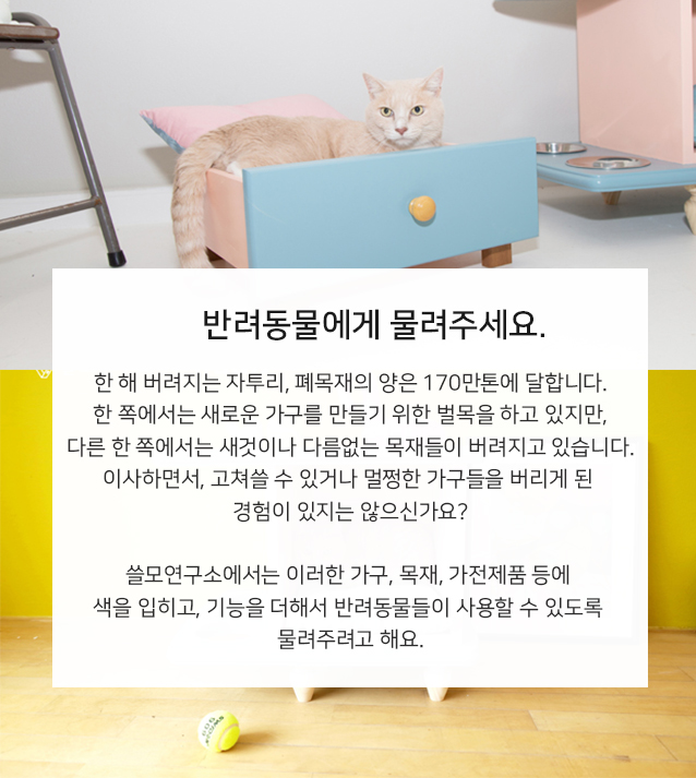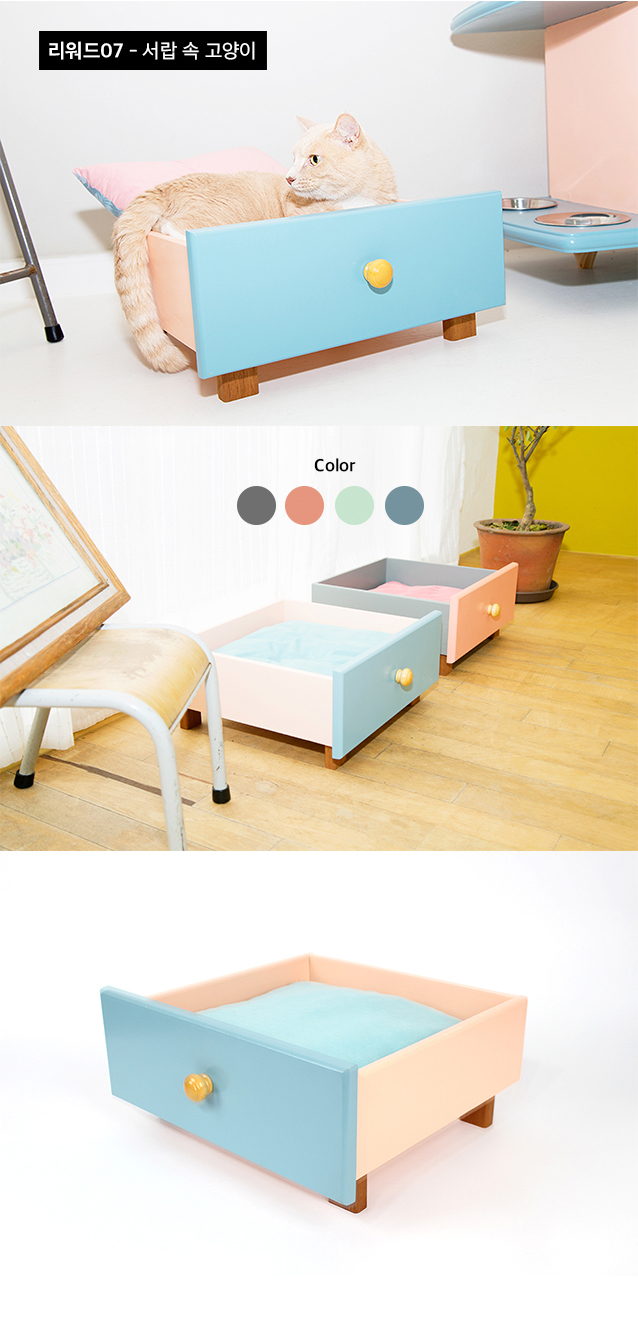 서랍을 업사이클해 만든 고양이 침대입니다. 비만 고양이도 여유있게 사용할 수 있도록 여유있는 사이즈로 골랐어요!