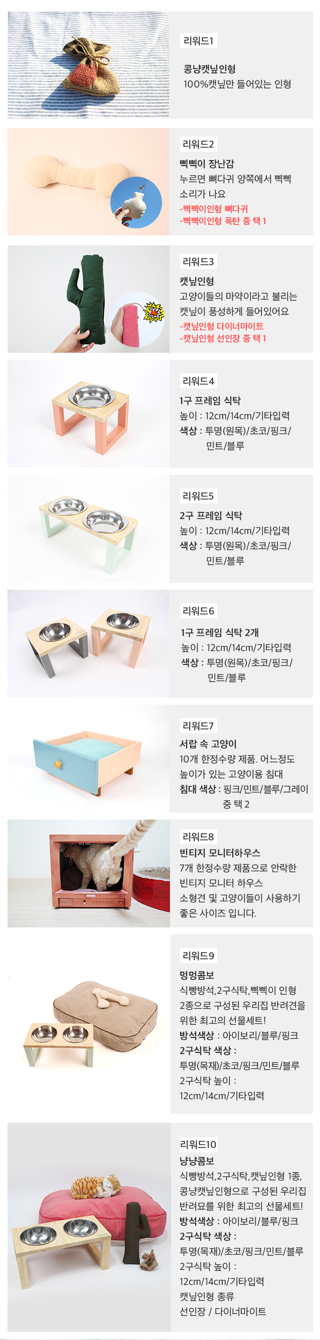 고급진 푹신푹신한 식빵방석 1개와 2구식탁 1개, 커다란 캣닢인형 하나와 조그맣지만 강렬한 콩냥캣닢인형하나가 포함되어 있습니다.