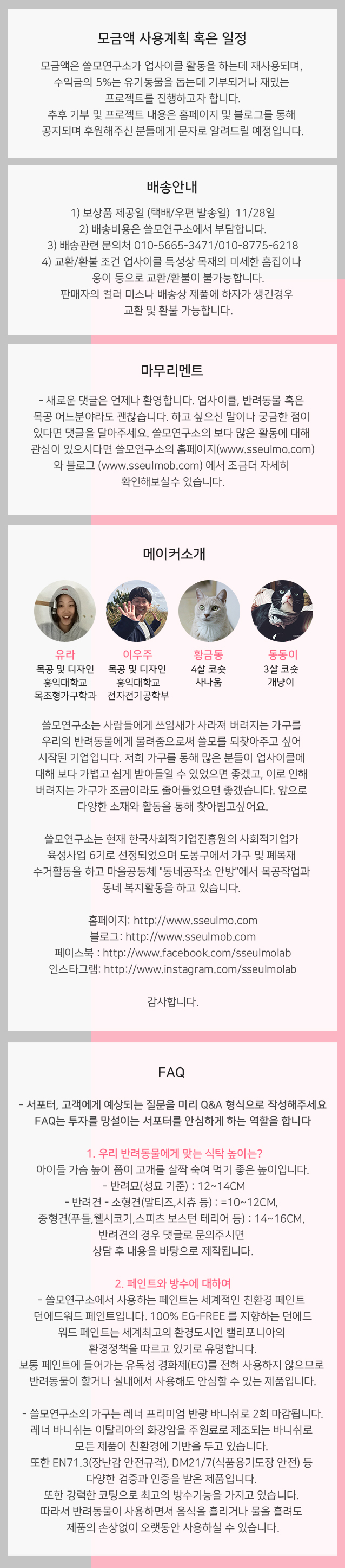친환경 무독성 페인트와 어린이 장난감에도 사용 인증을 받은 마감재로 방수 마감합니다. 키우시는 반려동물에 종에 따라 높이 선택이 가능합니다.