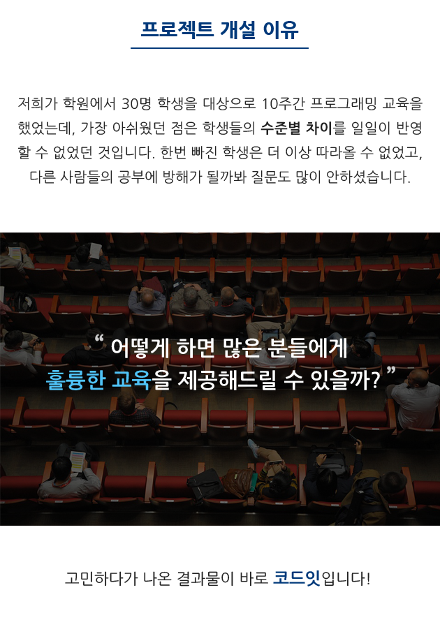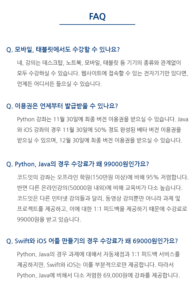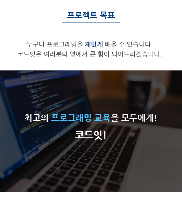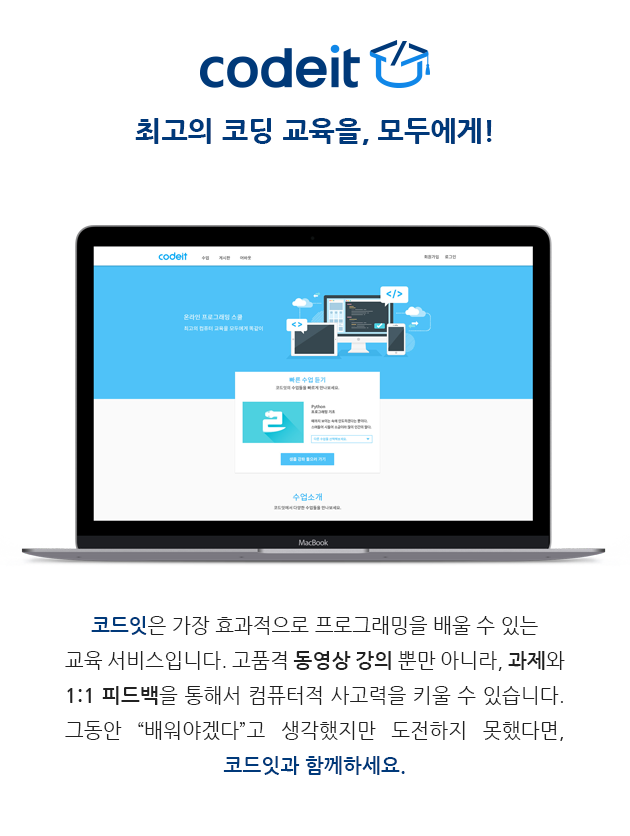 코드잇은 가장 효과적으로 프로그래밍을 배울 수 있는 교육 서비스입니다. 그동안 "배워야겠다"고 생각했지만 도전하지 못했다면, 코드잇과 함께하세요.